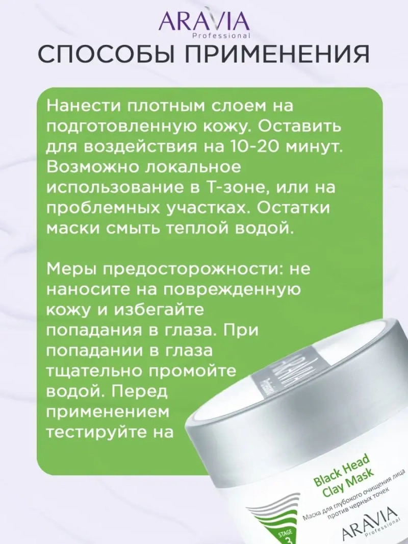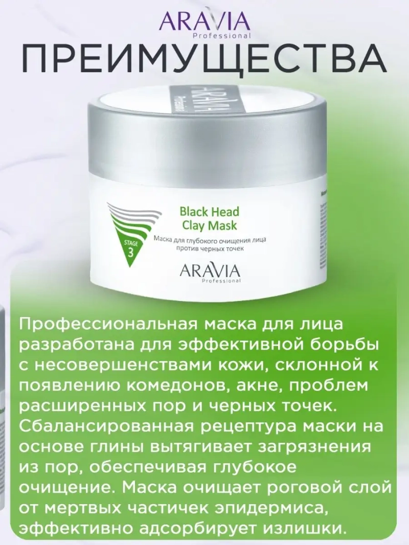 МАСКА ДЛЯ ГЛУБОКОГО ОЧИЩЕНИЯ ЛИЦА ПРОТИВ ЧЕРНЫХ ТОЧЕК BLACK HEAD CLAY MASK, 150 МЛ. Профессиональная маска для лица разработана для эффективной борьбы с несовершенствами кожи, склонной к появлению комедонов, акне, проблем расширенных пор и черных точек. Сбалансированная рецептура маски на основе глины вытягивает загрязнения из пор, обеспечивая глубокое очищение. Маска очищает роговой слой от мертвых частичек эпидермиса, эффективно адсорбирует излишки себума и продукты метаболизма, сокращает и осветляет поры, уменьшает количество комедонов и воспалительных элементов. Благодаря синергии активных компонентов маска обладает тонизирующим, освежающим и осветляющим действиями. Назначение: интенсивный уход, проведение поросуживающих процедур, программы детоксикации кожи. Рекомендации для использования: Профессиональный уход: завершение интенсивного ухода и в качестве самостоятельной процедуры.Домашний уход: рекомендуется к применению в домашнем межкурсовом уходе 1-2 раза в неделю для жирной кожи по назначению косметолога. ДЕЙСТВИЕ: очищающее, поросуживающее, матирующее, тонизирующее, себорегулирующее. Биоактивный состав: каолин, аллантоин, бисаболол, витамин Е, комплекс экстрактов. Каолин обладает отшелушивающим, подсушивающим действием, абсорбирует загрязнения и излишки кожного жира, стягивает поры, уменьшает раздражения. Аллантоин эффективно сужает поры и успокаивает кожу, увлажняет и повышает эластичность. Бисаболол успокаивает, снимает раздражения и шелушения, выравнивает поверхность кожи, осветляет пигментные пятна и следы от акне. Витамин Е — сильнейший антиоксидант, способствует обогащению крови кислородом, улучшает питание клеток и укрепляет стенки кровяных сосудов. Комплекс экстрактов череды, календулы, зеленого чая, чистотела, корня солодки, коры дуба борется с воспалениями, способствует уменьшению выработки себума, очищает и тонизирует.