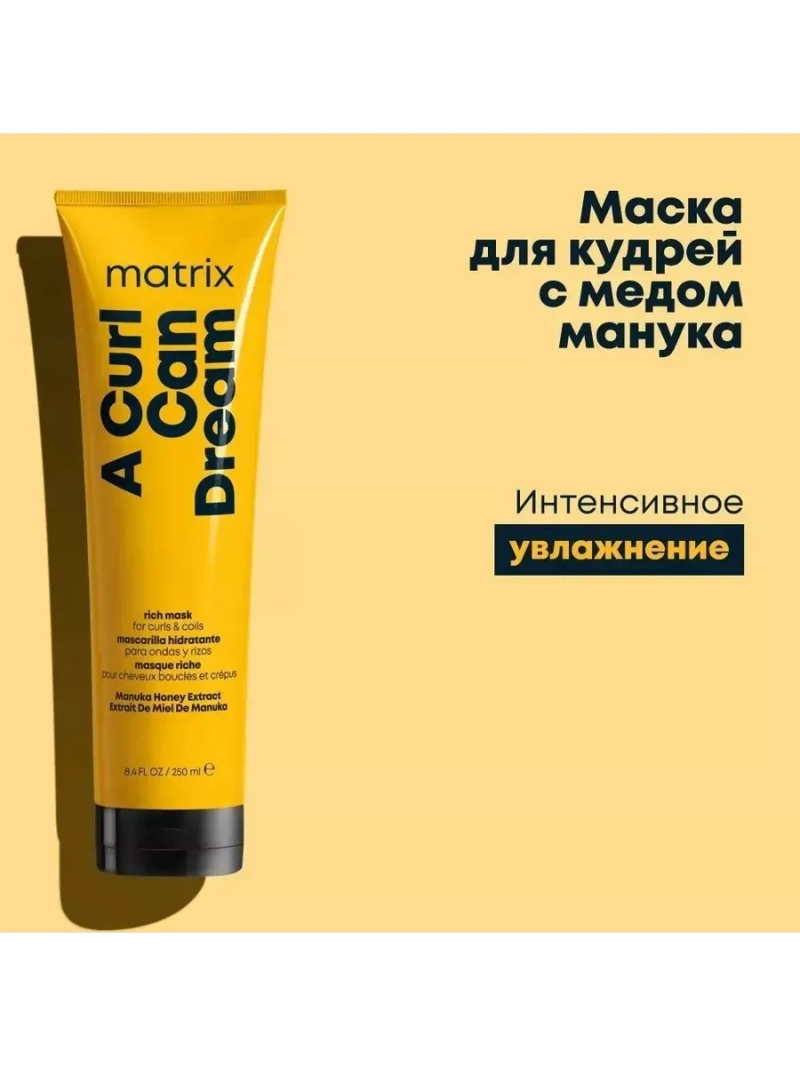 Matrix A Curl Can Dream Rich Mask - профессиональная маска для вьющихся и кудрявых волос с экстрактом меда манука.Глубоко увлажняет и питает пористые волосы, помогает сформировать красивый и упругий завиток.Не содержит парабены, минеральные масла, петролатум, парафины.Аромат раскрывается нотами розы, пиона, морской соли, ландыша и жасмина.Активные компоненты:- Экстракт меда манука содержит полезные питательные вещества, которые придают волосам естественный блеск и сияние. Увлажняет и восстанавливает.MATRIX Профессиональная маска интенсивного увлажнения для кудрявых и вьющихся волос A Curl Can Dream, 250 мл.У нас Вы всегда сможете подобрать женскую и мужскую парфюмерию, декоративную косметику, а так же уходовые средства для волос, тела и лица. Если вы ищете идеальный уход за волосами, то наша маска для волос это именно то, что вам нужно. Увлажняющая, питательная и восстанавливающая эти слова лучше всего описывают наши маски для волос. Маска для волос обогащена активными увлажняющими компонентами, которые обеспечивают интенсивный уход, устраняя сухость и ломкость. Восстанавливающая и питательная маска придаст локонам блеск и объем, поспособствует разглаживанию кутикулы, сделает расчесывание кудрявых и вьющихся волос особенно легким.Подходит для всех типов волос - тонких, ломких, пористых, сухих и окрашенных, для блонда, осветленных и обесцвеченных.Профессиональная маска для волос — идеальное и уникальное средство для ухода за кудрявыми и вьющимися волосами, разработанное с учетом их потребности в интенсивном увлажнении и питательном восстановлении каждой кудрявой пряди. Эта маска для волос восстанавливает структуру локонов, превращает их в мягкие, эластичные и красиво разделенные локоны. Благодаря питательному составу маска для ухода для кудрявых волос решает проблемы их сухости, ломкости и пушения, делает кудри живыми и блестящими, управляемыми и легкими в укладке. Как использовать: Нанести необходимое количество маски на волосы, вмассировать, смыть водой.