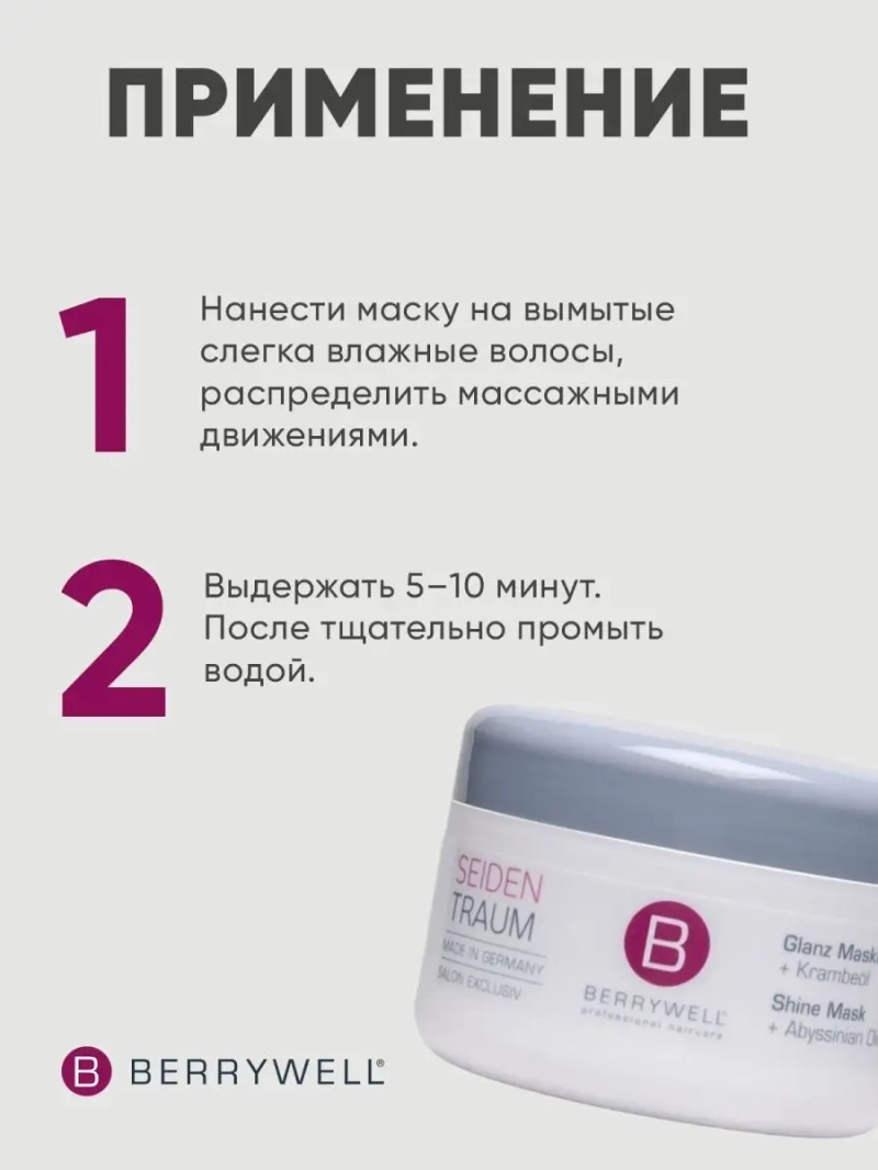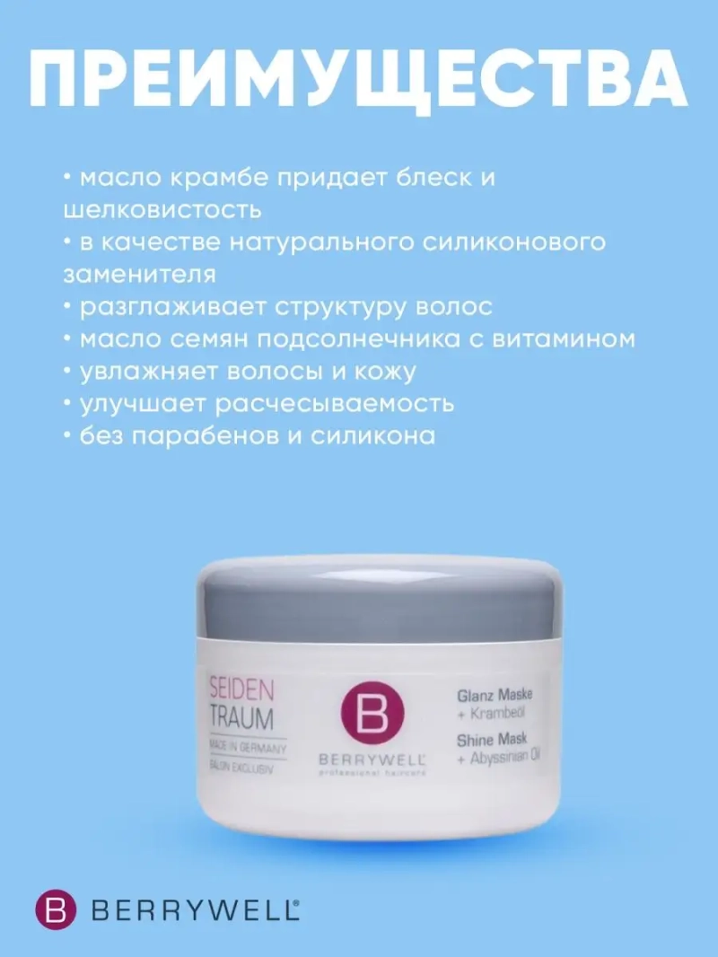 Маска для блеска Berrywell с комплексом активных веществ на основе масла крамбе, оказывает кондиционирующий эффект и разглаживает структуру волос. Увлажняющие ингредиенты обеспечивают шелковистость, упругость и эластичность волос.Применение: распределить по всей длине и кончикам высушенных полотенцем волос. Дать впитаться в течение 5 минут и тщательно промыть.масло крамбе придает блеск и шелковистость в качестве натурального силиконового заменителяразглаживает структуру волосмасло семян подсолнечника с витамином Аувлажняет волосы и кожуулучшает расчесываемостьбез парабенов и силикона