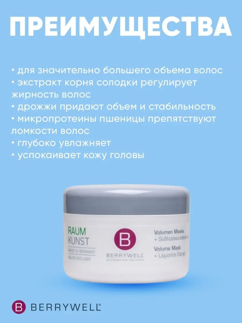 Маска для придания объема Volume Mask plus. Натуральные микропротеины пшеницы, что в составе маски, поддерживают природную густоту и объем волос. Провитамин B5 снабжает влагой тонкие волосы, не отягощая их. Комплекс натуральных биологически активных веществ с содержанием экстракта конского каштана успокаивает кожу головы с активными сальными железами. Идеальное средство для тонких волос.
