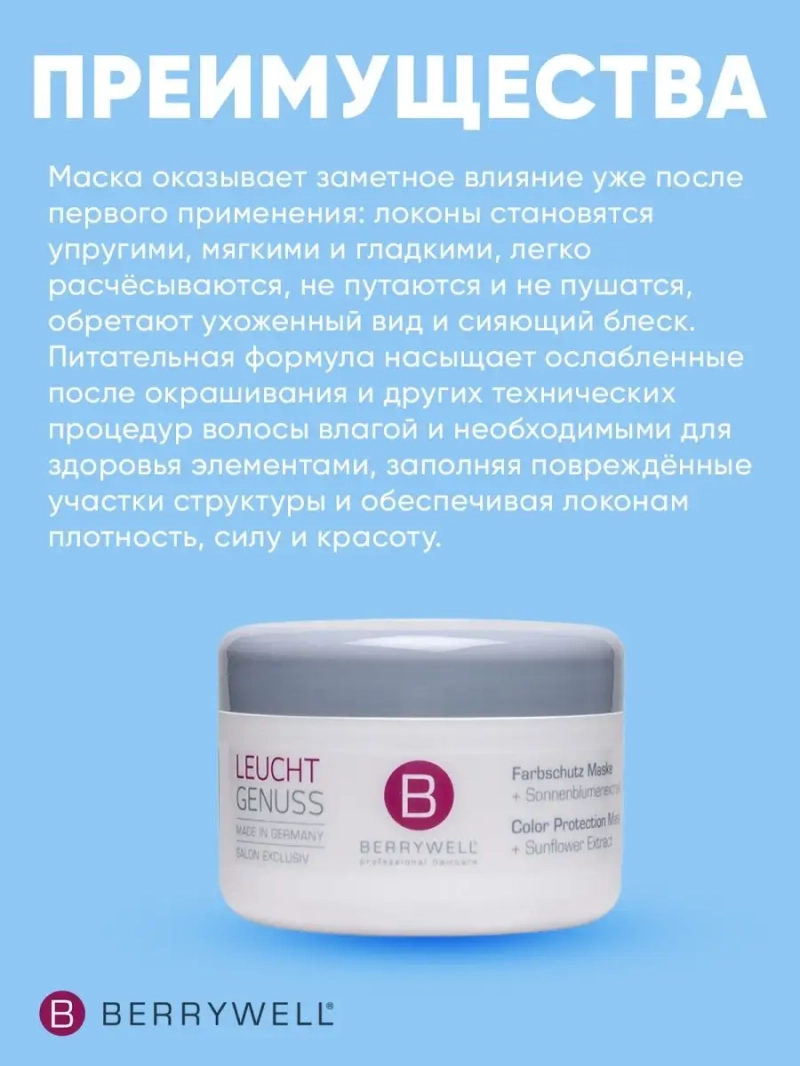 Маска восстанавливающая для окрашенных волос Berrywell Color Protection Mask 201 мл. Маска Berrywell Color Protection Mask – это интенсивное средство, предназначенное для бережного восстановления и защиты цвета окрашенных волос. Маска оказывает заметное влияние уже после первого применения: локоны становятся упругими, мягкими и гладкими, легко расчёсываются, не путаются и не пушатся, обретают ухоженный вид и сияющий блеск.Питательная формула насыщает ослабленные после окрашивания и других технических процедур волосы влагой и необходимыми для здоровья элементами, заполняя повреждённые участки структуры и обеспечивая локонам плотность, силу и красоту.Провитамин B5 дарит непревзойдённое увлажнение, уплотняет и укрепляет пряди, обеспечивает эластичность, гибкость и очаровательный блеск, предотвращает тусклость и появление секущихся кончиков.Экстракт подсолнуха улучшает регенеративные способности, препятствует потере драгоценной влаги, наполняет локоны жизненными силами, упругостью и защищает от внешних факторов, препятствуя выгоранию цвета и потере блеска.Кондиционирующий комплекс на основе полимеров делает пряди мягкими и послушными, не утяжеляя и надолго сохраняя свежесть причёски.Применение: нанести на чистые, чуть влажные волосы и распределить по всей длине. Оставить на 5-10 минут, после тщательно смыть водой.