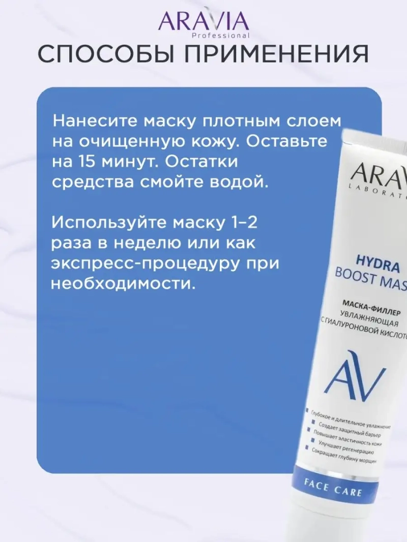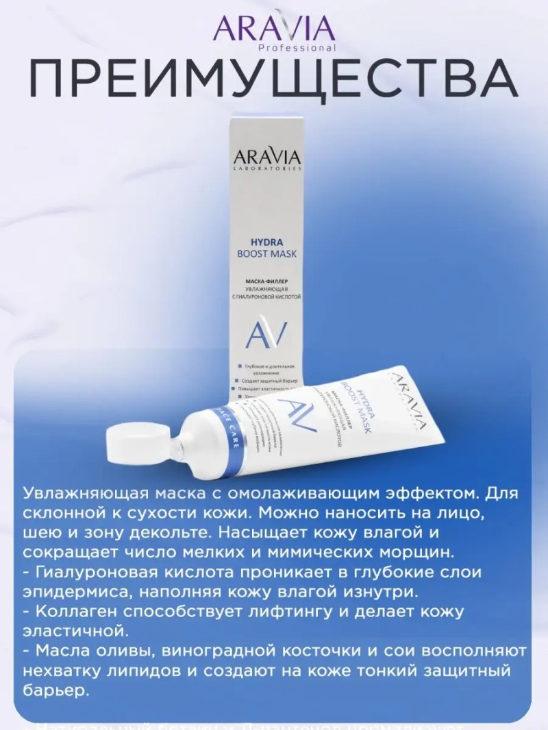 МАСКА-ФИЛЛЕР УВЛАЖНЯЮЩАЯ С ГИАЛУРОНОВОЙ КИСЛОТОЙ HYDRA BOOST MASK, 100 МЛ. Увлажняющая маска для склонной к сухости кожи лица, шеи и зоны декольте. Низкомолекулярная гиалуроновая кислота проникает в глубокие слои эпидермиса, наполняя кожу влагой изнутри. Рекомендации для использования: использовать 1-2 раза в неделю. ДЕЙСТВИЕ: увлажняющее, защитное, регенерирующее, повышает эластичность, сокращает глубину морщин. Биоактивный состав: гиалуроновая кислота, Д-пантенол, бетаин, коллаген, масло оливы, масло виноградной косточки, масло сои, витамин Е. Д-пантенол обладает увлажняющим, заживляющим, смягчающим и разглаживающим действием. Делает кожу более эластичной, оказывает успокаивающее действие.Бетаин активно увлажняет, снимает раздражения, улучшает внешний вид кожи.Коллаген делает кожу упругой и эластичной. Обладает успокаивающим действием, удерживает влагу в глубоких слоях кожи, оказывает регенерирующий эффект. Повышает упругость кожи. Убирает сухость и обезвоженность.Масло виноградной косточки глубоко проникает в кожу и способствует удержанию влаги. Помогает вернуть коже упругость, разглаживает морщины, устраняет вялость кожи, активизирует обмен веществ в клетках кожи. Масло сои — источник лецитина и витаминов. Увлажняет, смягчает кожу, замедляет процесс увядания. Восстанавливает защитный эпидермальный барьер и влагоудерживающую способность кожи. Витамин Е способствует обновлению клеток, замедляет появление видимых признаков старения кожи, в том числе преждевременное образование морщин, борется со свободными радикалами, уменьшает пигментацию, улучшает насыщение клеток кислородом, помогает поддерживать уровень влаги, способствует повышению упругости. СПОСОБ ПРИМЕНЕНИЯ: На очищенную кожу нанесите маску плотным слоем. Оставьте на 15 минут, остатки смойте водой.Меры предосторожности: не наносите на поврежденную кожу и избегайте попадания в глаза. При попадании в глаза тщательно промойте водой. Перед применением тестируйте на небольшом участке кожи.