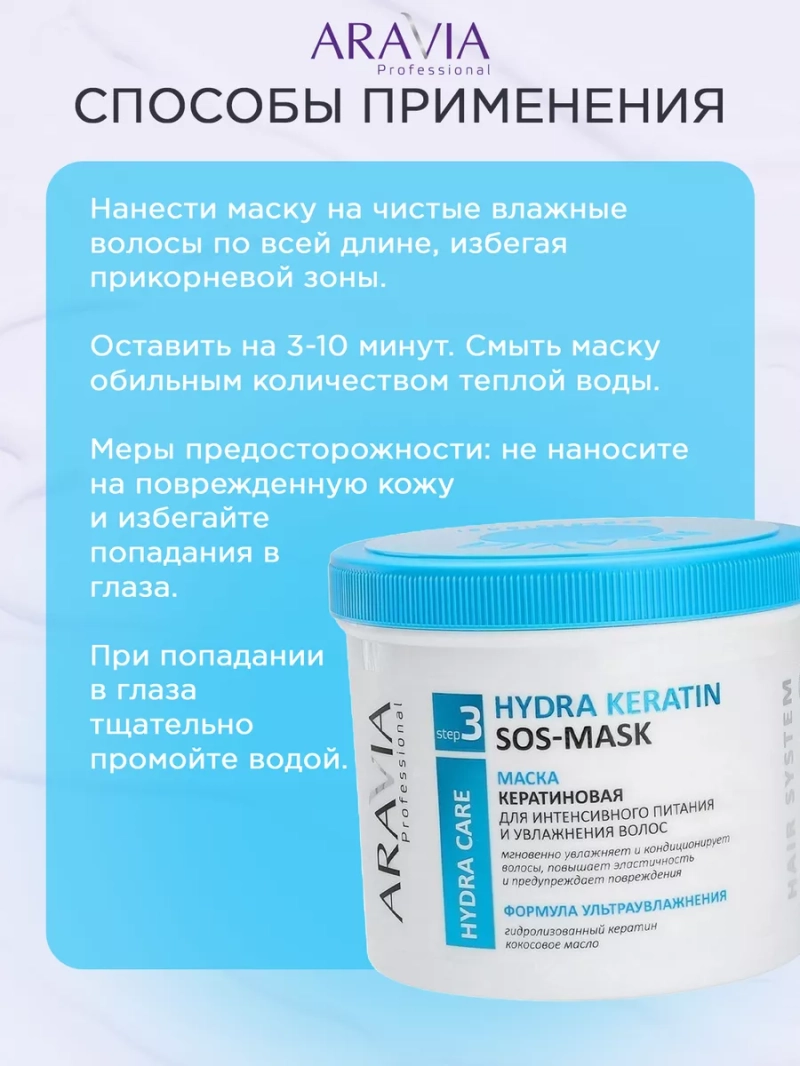МАСКА КЕРАТИНОВАЯ ДЛЯ ИНТЕНСИВНОГО ПИТАНИЯ И УВЛАЖНЕНИЯ ВОЛОС HYDRA KERATIN SOS-MASK, 550 МЛ. Активная формула маски для интенсивного увлажнения, восстановления и улучшения качества даже самых поврежденных волос. Непревзойденная синергия кератина и кокосового масла в сочетании с густой кремовой текстурой глубоко питает и оживляет волосы, повышает их упругость и эластичность. Маска укрепляет защитные функции волос и обеспечивает профилактику дефицита кератина. Оказывает стойкий кондиционирующий эффект, сглаживая кутикулу, улучшая послушность и облегчая процесс расчесывания. Назначение: кондиционирование волос, восстановление, увлажнение, придание блеска, улучшение распутывания и расчесывания, облегчение и улучшение укладки. Рекомендации для использования: подходит для профессионального и домашнего ухода. Биоактивный состав: гидролизованный кератин, кокосовое масло. Гидролизованный кератин обволакивает невесомым слоем и поддерживает красоту и силу волос, запечатывая имеющиеся поврежденные участки и повышая плотность, прочность и упругость, надежно защищает от истончения и дальнейшего образования структурных повреждений, выравнивает рельеф и облегчает укладку, удерживает влагу внутри волоса и придает здоровый мерцающий блеск. Кокосовое масло является самым богатым из всех растительных масел природным источником насыщенных жирных кислот, обладает высокой проникающей в стержень волоса способностью, насыщает ценными микроэлементами и витаминами А, Е, К, активно увлажняет, придает шелковистость и повышает эластичность, предотвращая ломкость и сечение волос, а также облегчая расчесывание. СПОСОБ ПРИМЕНЕНИЯ: Нанести маску на чистые влажные волосы по всей длине, избегая прикорневой зоны. Оставить на 3-10 минут. Смыть маску обильным количеством теплой воды. Меры предосторожности: не наносите на поврежденную кожу и избегайте попадания в глаза. При попадании в глаза тщательно промойте водой.