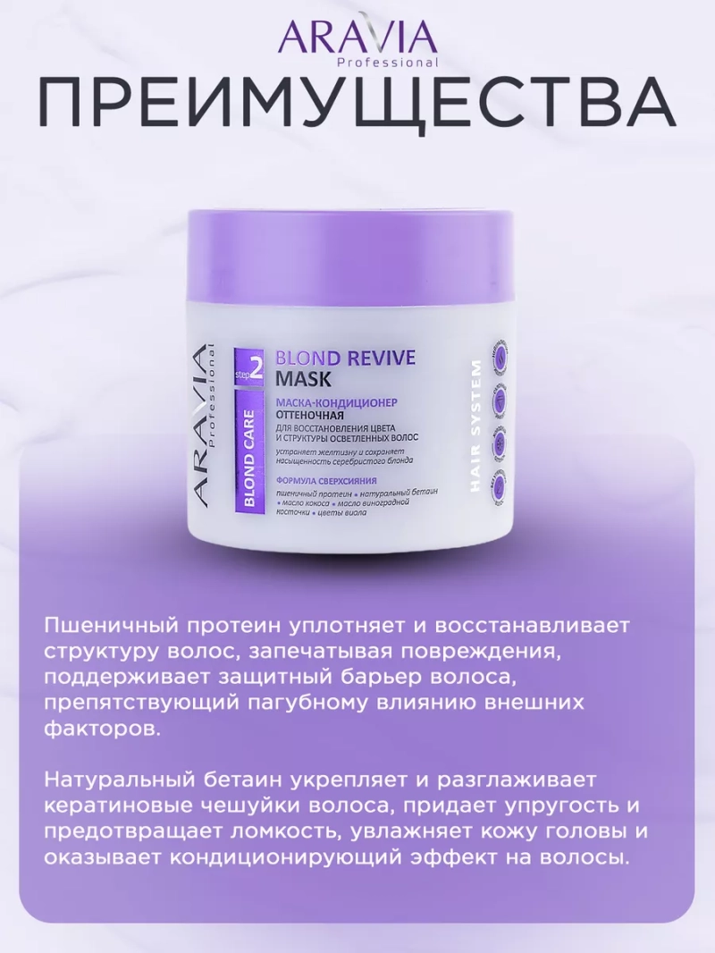 МАСКА-КОНДИЦИОНЕР ОТТЕНОЧНАЯ ДЛЯ ВОССТАНОВЛЕНИЯ ЦВЕТА И СТРУКТУРЫ ОСВЕТЛЕННЫХ ВОЛОС BLOND REVIVE MASK, 300 МЛ. После использования шампуня промокните волосы полотенцем. Распределите маску-кондиционер по всей длине волос. Оставьте на 1-5 минут в зависимости от желаемой интенсивности эффекта, смойте обильным количеством теплой воды. Рекомендуем проводить процедуру в одноразовых перчатках. При использовании оттеночной маски-кондиционера Blond Revive Mask рекомендуем применять шампунь, не имеющий оттеночных свойств. Меры предосторожности: не наносите на поврежденную кожу и избегайте попадания в глаза. При попадании в глаза тщательно промойте водой. Биоактивный состав: пшеничный протеин, натуральный бетаин, масло кокоса, масло виноградной косточки, цветы виола. Пшеничный протеин уплотняет и восстанавливает структуру волос, запечатывая повреждения, поддерживает защитный барьер волоса, препятствующий пагубному влиянию внешних факторов. Натуральный бетаин укрепляет и разглаживает кератиновые чешуйки волоса, придает упругость и предотвращает ломкость, увлажняет кожу головы и оказывает кондиционирующий эффект на волосы. Масло виноградной косточки укрепляет тонкие, ослабленные и поврежденные пряди, питает и увлажняет корни волос, предотвращая появление сухости, помогает защитить волосы от вредного воздействия окружающей среды. СПОСОБ ПРИМЕНЕНИЯ: После использования шампуня промокните волосы полотенцем. Распределите маску-кондиционер по всей длине волос. Оставьте на 1-5 минут в зависимости от желаемой интенсивности эффекта, смойте обильным количеством теплой воды. Рекомендуем проводить процедуру в одноразовых перчатках. При использовании оттеночной маски-кондиционера Blond Revive Mask рекомендуем применять шампунь, не имеющий оттеночных свойств. Меры предосторожности: не наносите на поврежденную кожу и избегайте попадания в глаза. При попадании в глаза тщательно промойте водой.