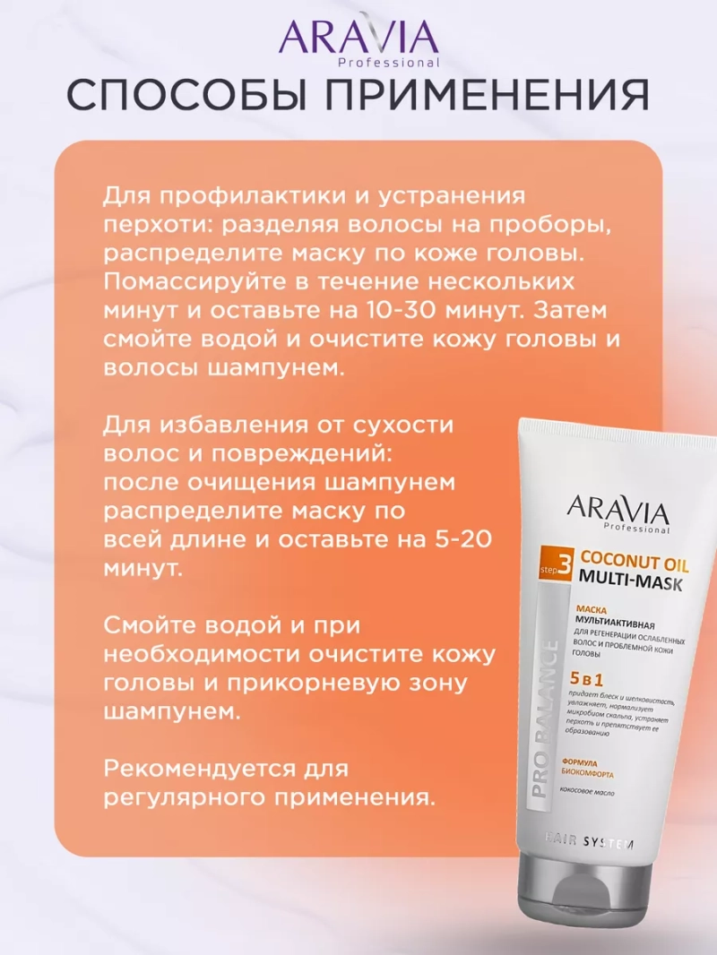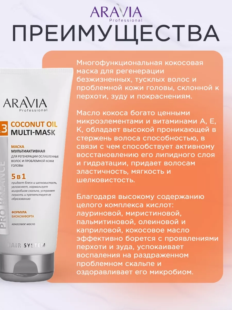 МАСКА МУЛЬТИАКТИВНАЯ 5 В 1 ДЛЯ РЕГЕНЕРАЦИИ ОСЛАБЛЕННЫХ ВОЛОС И ПРОБЛЕМНОЙ КОЖИ ГОЛОВЫ COCONUT OIL MULTI-MASK, 200 МЛ. Многофункциональная кокосовая маска для регенерации безжизненных, тусклых волос и проблемной кожи головы, склонной к перхоти, зуду и покраснениям. Масло кокоса богато ценными микроэлементами и витаминами А, Е, К, обладает высокой проникающей в стержень волоса способностью, в связи с чем способствует активному восстановлению его липидного слоя и гидратации, придает волосам эластичность, мягкость и шелковистость. Благодаря высокому содержанию целого комплекса кислот: лауриновой, миристиновой, пальмитиновой, олеиновой и каприловой, кокосовое масло эффективно борется с проявлениями перхоти и зуда, успокаивает воспаления на раздраженном проблемном скальпе и оздоравливает его микробиом. Регулярное применение маски защищает структуру волос от повреждений, придает блеск и глубоко увлажняет, оказывает стойкое противовоспалительное и антимикробное действие, устраняя перхоть и нормализуя состояние как жирной, так и сухой кожи головы. Назначение: восстановление, питание и увлажнение кожи головы и волос, предотвращение перхоти, зуда и раздражения. Рекомендации для использования: для профессионального и домашнего ухода. Биоактивный состав: кокосовое масло. Кокосовое масло является богатым природным источником с самой высокой концентрацией насыщенных жирных кислот по сравнению с другими растительными маслами, обладает антимикробными и противовоспалительными свойствами, борется с перхотью, глубоко увлажняет, укрепляет и защищает волосы. Состав продукта (INCI): Aqua, Cetearyl Alcohol, Cocos Nucifera Seed Butter, Glycerin, Phenoxyethanol, Dipalmitoylethyl Hydroxyethylmonium Methosulfate, Cetrimonium Chloride, Ceteareth-20, Methylparaben, Parfum, Propylparaben, Ethylparaben, Citric Acid, Limonene, Coumarin.