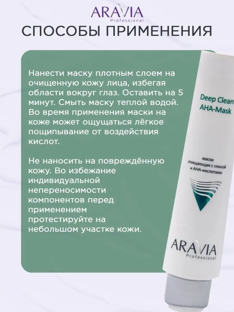 МАСКА ОЧИЩАЮЩАЯ С ГЛИНОЙ И AHA-КИСЛОТАМИ ДЛЯ ЛИЦА DEEP CLEAN AHA-MASK, 100 МЛ. Комфортная и эффективная очищающая маска на основе зелёной глины и AHA-кислот. Маска тщательно удаляет загрязнения и остатки себума, глубоко очищает поры, способствует их сужению. Назначение: глубокое очищение кожи, эксфолиация. Рекомендации для использования: Домашний уход: 1-2 раза в неделю для глубокого очищения кожи лица. Биоактивный состав: зеленая глина, масло авокадо, молочная кислота, гликолевая кислота, винная кислота, яблочная кислота, лимонная кислота. Состав продукта (INCI): Aqua, Lactic Acid, Emulsifying wax, Persea Gratissima (Avocado) Oil, Glycerin, Glycolic Acid, Diazolidinyl Urea, Phenoxyethanol (and) Ethylhexylglycerin, Propylene Glycol, Hydroxyethylcellulose, Cellulose Gum, Kaolin, Malic Acid, Parfum, Sodium EDTA, Tartatic Acid, Citric Acid. СПОСОБ ПРИМЕНЕНИЯ: Нанести маску плотным слоем на очищенную кожу лица, избегая области вокруг глаз. Оставить на 5 минут. Смыть маску теплой водой. Во время применения маски на коже может ощущаться лёгкое пощипывание от воздействия кислот. Меры предосторожности: не наносите на поврежденную кожу и избегайте попадания в глаза. При попадании в глаза тщательно промойте водой. Перед применением тестируйте на небольшом участке кожи.