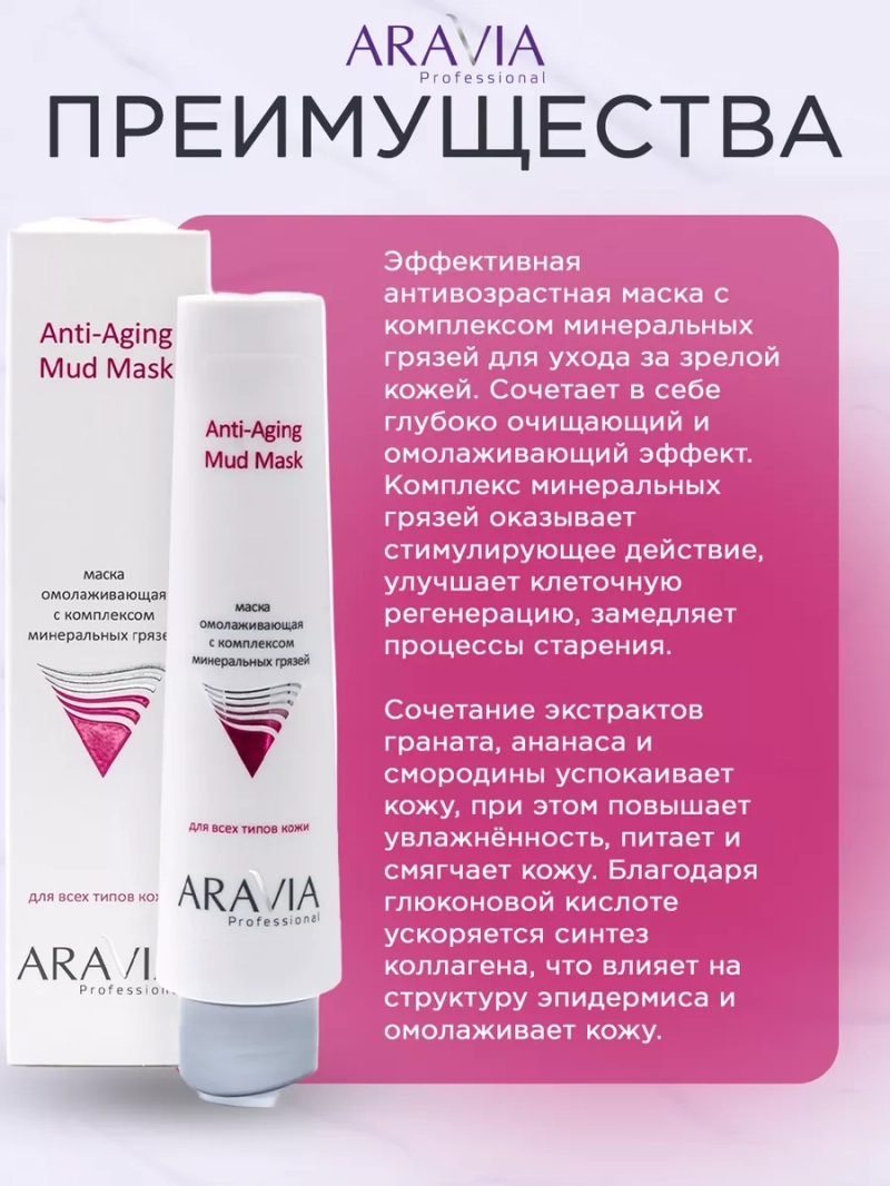 МАСКА ОМОЛАЖИВАЮЩАЯ С КОМПЛЕКСОМ МИНЕРАЛЬНЫХ ГРЯЗЕЙ ANTI-AGING MUD MASK, 100 МЛ. Эффективная антивозрастная маска с комплексом минеральных грязей для ухода за зрелой кожей. Сочетает в себе глубоко очищающий и омолаживающий эффект. Маска насыщает кожу витаминами и минералами, обладает детоксицирующим и дренажным эффектом, повышает тонус и эластичность, улучшает внешний вид кожи. После курса процедур заметно выравнивается микрорельеф, уменьшается количество и глубина морщин. Благодаря кремовой основе маска легко наносится и не высыхает на коже. Назначение: маска для лица и шеи, для возрастной кожи. Рекомендации для использования: Домашний уход: рекомендуется использовать 2-3 раза в неделю. ДЕЙСТВИЕ: разглаживающее, увлажняющее, очищающее, профилактика возрастных изменений. Биоактивный состав: комплекс минеральных грязей, глюконовая кислота, глина голубая, масло кокоса, ниацинамид, экстракты граната, ананаса, смородины. Состав продукта (INCI): Аqua, Mineral Mud, Zea Mays (Corn) Germ Oil, Glycerin, Silt, Cocos Nucifera (Coconut) Oil, Potassium Cetyl Phosphate, Cetearyl Alcohol, Niacinamide, Stearic Acid, Punica Granatum Bark Extract, Ananas Sativus (Pineapple) Extract, Ribes Nigrum (Black Currant) Fruit Juice, Phenoxyethanol (and) Ethylhexylglycerin, Glucono Delta Lactone, Triethanolamine, Hexylcinnamaldehyd, Benzyl Alcohol. СПОСОБ ПРИМЕНЕНИЯ: На очищенную кожу лица нанести маску, избегая области вокруг глаз. Оставить на 15-20 минут. Смыть маску теплой водой. Меры предосторожности: не наносите на поврежденную кожу и избегайте попадания в глаза. При попадании в глаза тщательно промойте водой. Перед применением тестируйте на небольшом участке кожи.