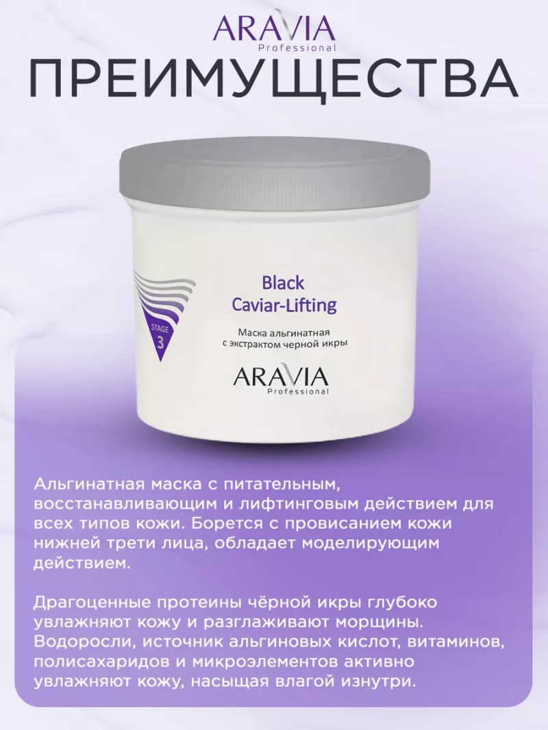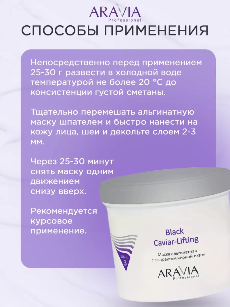 Альгинатная маска с питательным, восстанавливающим и лифтинговым действием для всех типов кожи. Борется с провисанием кожи нижней трети лица, обладает моделирующим действием. Драгоценные протеины чёрной икры глубоко увлажняют кожу и разглаживают морщины. Водоросли, источник альгиновых кислот, витаминов, полисахаридов и микроэлементов активно увлажняют кожу, насыщая влагой изнутри. Шишки хмеля замеляют процессы увядания и потери тонуса кожи. Курсовое применение маски способствует улучшению внешнего вида кожи, сиянию «изнутри», здоровому цвету лица.Назначение: лифтинг, глубокое увлажнение, питаниеСпособ применения: непосредственно перед применением 9 ложек порошка (30 г) развести в 90 мл холодной воды температурой не более 20 °С. Перемешать альгинатную маску до консистенции густой сметаны и быстро нанести на кожу лица, шеи и декольте слоем 2-3 мм. Через 25-30 минут снять маску одним движением снизу вверх. Рекомендуется курсовое применение.Результат: мгновенное улучшение внешнего вида кожи.Состав: Diatomaceous Earth (диатомовые водоросли), Algin (альгиновые кислоты), Calcium Sulphate, Sodium Pyrophosphate, Caviar Extract (экстракт икры), Humulus Lupulus Extract (шишки хмеля)