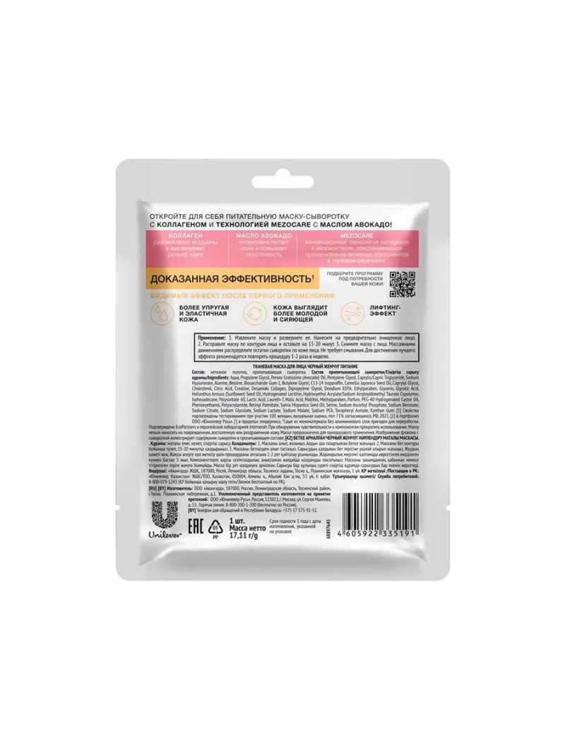 Тканевая маска-сыворотка для лица Черный Жемчуг Питание - это маска с технологией Mezocare: материал и мезококтейль обеспечивают проникновение активных компонентов в глубокие слои кожи. Технология создана специально для повышения упругости и эластичности кожи и её интенсивного питания. В составе сыворотки, пропитывающей маску, содержится жидкий коллаген и комплекс аминокислот, которые активизируют выработку клетками кожи собственных коллагена и эластина. Гиалурон активно увлажняет и повышает тонус кожи. Масло авокадо интенсивно питает и разглаживает, масло камелии помогает коже компенсировать последствия воздействия стресс-факторов. Тканевая маска для лица Черный Жемчуг Питание интенсивно питает и увлажняет кожу, разглаживает морщинки, повышает упругость и эластичность кожи, снимает ощущение сухости и стянутости, поддерживает естественный процесс восстановления клеток кожи. После использования маски для лица кожа становится более гладкой, упругой и эластичной.