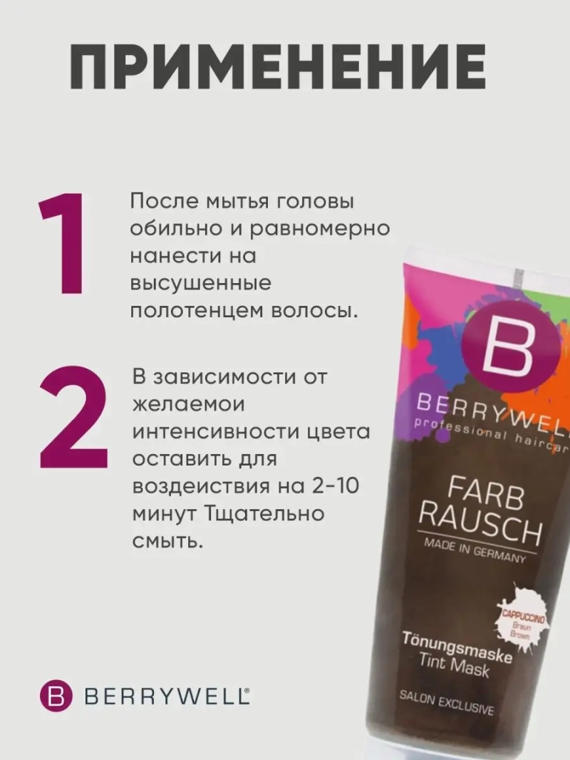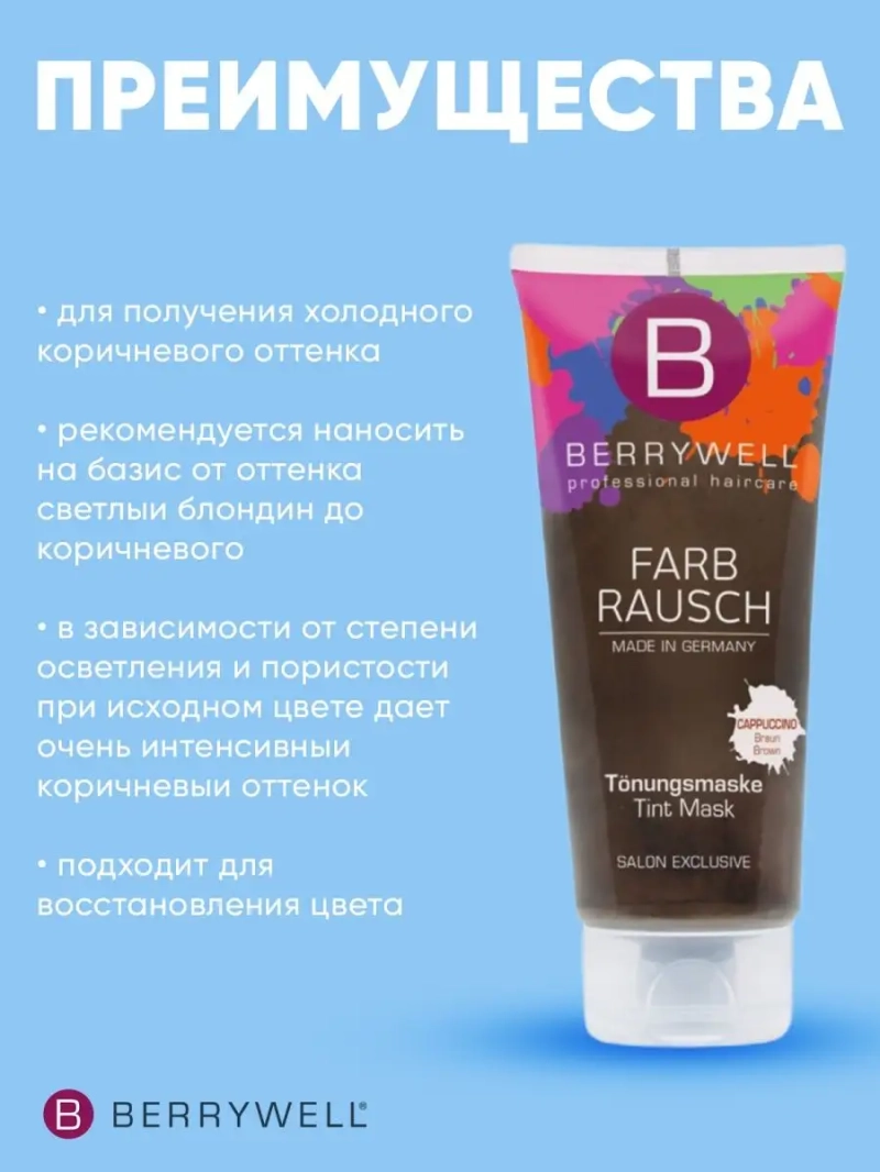 Маска тонирующая TINT MASK CAPPUCCINO 201 мл (Brown). Используется: для получения холодного коричневого оттенка;рекомендуется наносить на базис от оттенка светлый блондин до коричневого;в зависимости от степени осветления и пористости при исходном цвете дает очень интенсивный коричневый оттенок;подходит для восстановления цвета.Применение: После мытья головы обильно и равномерно нанести на высушенные полотенцем волосы. В зависимости от желаемой интенсивности цвета оставить для воздействия на 2-10 минут Тщательно смыть.Примечание: Во избежание загрязнения кожи или одежды в завершение полностью высушите волосы.Пожалуйста, используйте, подходящие перчатки.