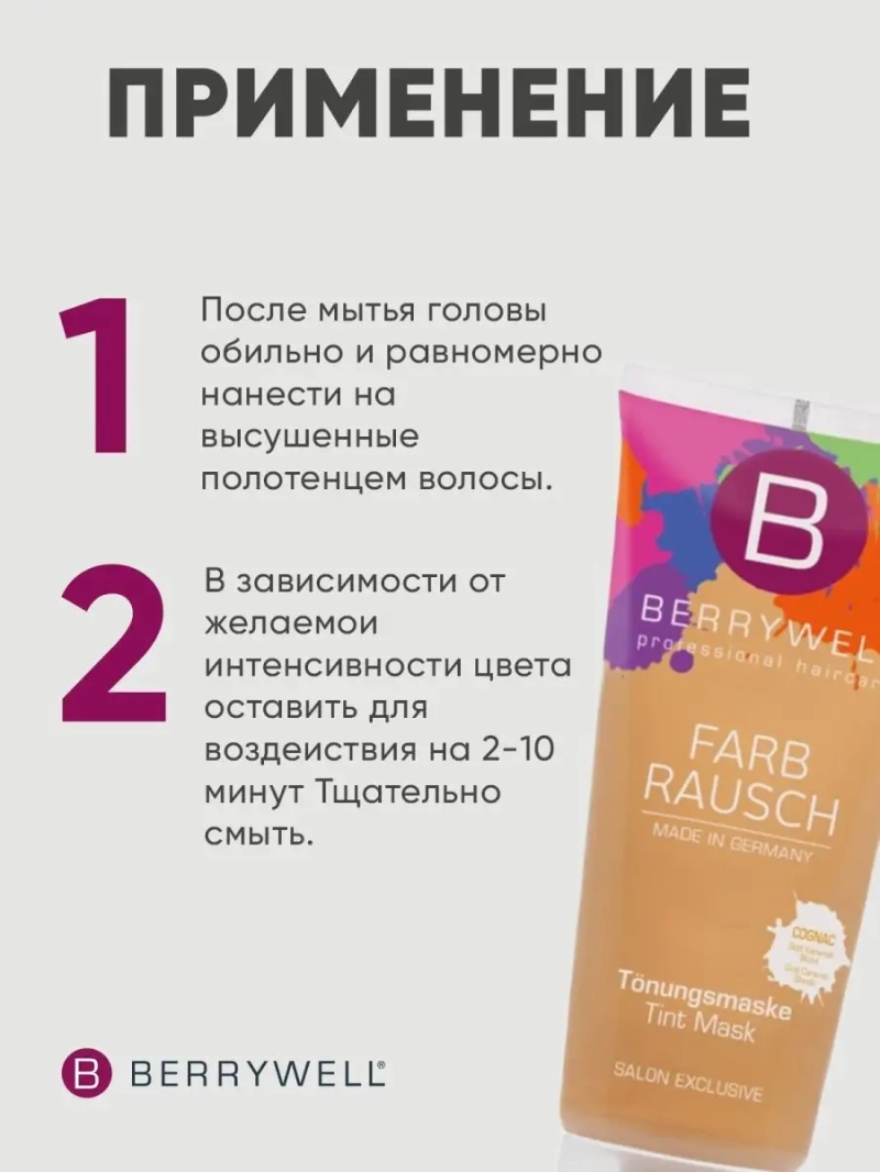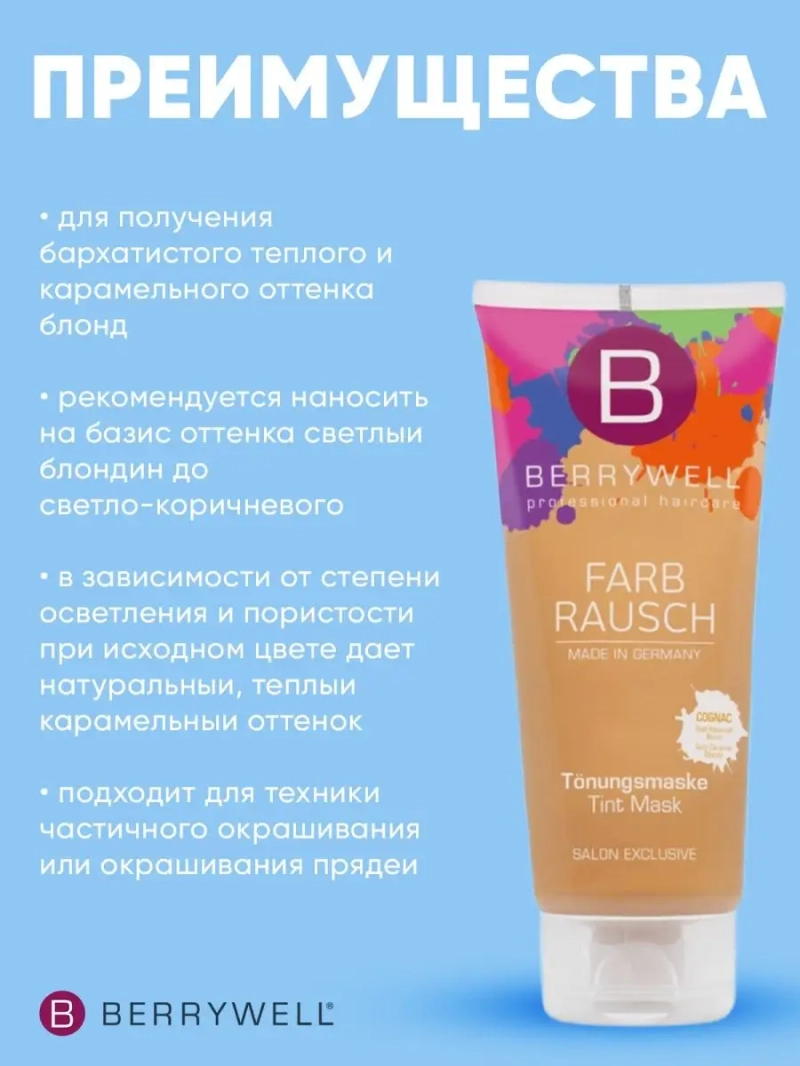 Маска тонирующая TINT MASK COGNAC 201 мл (warm Blonde). Используется: для получения бархатистого теплого и карамельного оттенка блонд;рекомендуется наносить на базис оттенка светлый блондин до светло-коричневого;в зависимости от степени осветления и пористости при исходном цвете дает натуральный, теплый карамельный оттенок;подходит для техники частичного окрашивания или окрашивания прядей.Применение: После мытья головы обильно и равномерно нанести на высушенные полотенцем волосы.В зависимости от желаемой интенсивности цвета оставить для воздействия на 2-10 минут Тщательно смыть.Примечание: Во избежание загрязнения кожи или одежды в завершение полностью высушите волосы.Пожалуйста, используйте, подходящие перчатки.