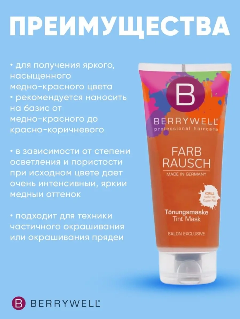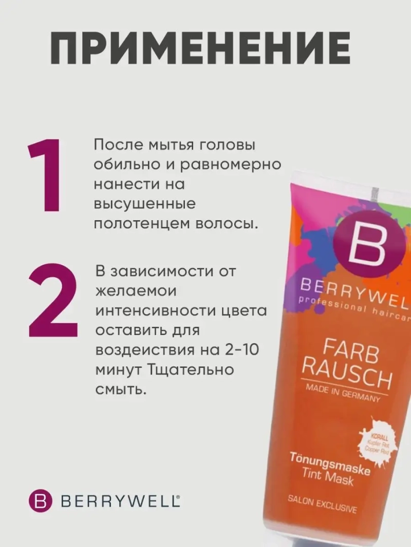 Маска тонирующая TINT MASK KORALL 201 мл (Copper). Применяется: для получения яркого, насыщенного медно-красного цвета;рекомендуется наносить на базис от медно-красного до красно-коричневого;в зависимости от степени осветления и пористости при исходном цвете дает очень интенсивныий, яркиий медныий оттенок;подходит для техники частичного окрашивания или окрашивания прядеий.Применение: После мытья головы обильно и равномерно нанести на высушенные полотенцем волосы.В зависимости от желаемоий интенсивности цвета оставить для воздеийствия на 2-10 минут Тщательно смыть.Примечание: Во избежание загрязнения кожи или одежды в завершение полностью высушите волосы.Пожалуийста, используийте, подходящие перчатки.