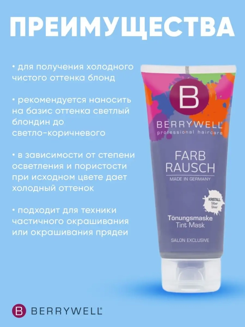Маска тонирующая TINT MASK KRISTALL 201 мл (Anti Yellow). Маска создана для придания холодного чистого оттенка блонд. Цветовые пигменты придают волосам более светлое и чистое сияние. Просто мечта о холодном блонде.Способ применения: Нанести на вымытые, подсушенные полотенцем волосы, слегка расчесать и оставить для воздействия на 2 – 10 минут. Тщательно смыть теплой водой. Использовать перчатки!Меры предосторожности: Хранить в недоступном для детей месте. Продукт не для лиц младше 16 лет. Средства для окрашивания волос могут вызывать аллергические реакции. Временные татуировки хной могут усиливать аллергическую реакцию. Избегайте окрашивания волос в случае, если: у Вас на коже лица присутствует сыпь, или при чувствительной, раздраженной или поврежденной коже головы повреждения;у Вас ранее были аллергические реакции при окрашивании волос;если у Вас ранее были аллергические реакции при нанесении временных татуировок хной. Не использовать для окрашивания бровей и ресниц. Избегать контакта с глазами. При контакте с глазаме смыть. Не превышать время воздействия. Тщательно смывать после воздействия. При попадании капель на кожу и одежда сразу смыть.