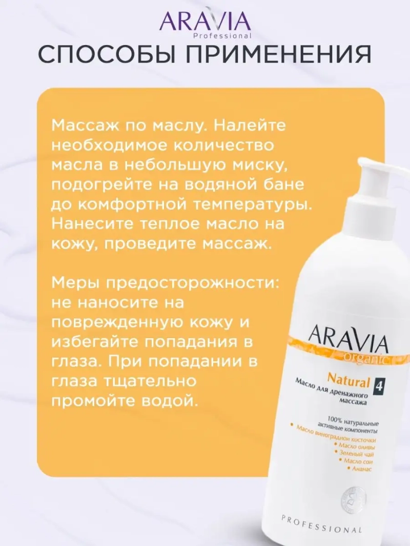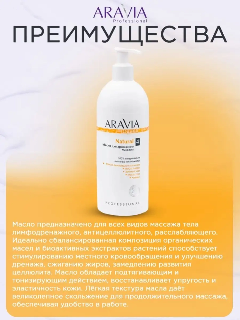 МАСЛО ДЛЯ ДРЕНАЖНОГО МАССАЖА NATURAL, 500 МЛ. Масло предназначено для всех видов массажа тела лимфодренажного, антицеллюлитного, расслабляющего. Идеально сбалансированная композиция органических масел и биоактивных экстрактов растений способствует стимулированию местного кровообращения и улучшению дренажа, сжиганию жиров, замедлению развития целлюлита. Масло обладает подтягивающим и тонизирующим действием, восстанавливает упругость и эластичность кожи. Лёгкая текстура масла даёт великолепное скольжение для продолжительного массажа, обеспечивая удобство в работе. Назначение: все виды массажа, SPA-программы. Рекомендации для использования: Профессиональный уход: массаж по маслу. ДЕЙСТВИЕ: подтягивающее, тонизирующее, расслабляющее, восстанавливающее. Биоактивный состав: масло виноградной косточки, ананас, масло оливы, зеленый чай, масло сои. Состав продукта (INCI): Glycine Soja (Soybean) Oil, Ananas Sativus Fruit, Camelia Sinensis Leaf Extract, Olea Europaea (Olive) Fruit Oil, Vitis Vinifera (Grape) Seed Oil, Parfum. СПОСОБ ПРИМЕНЕНИЯ: Массаж по маслу. Налейте необходимое количество масла в небольшую миску, подогрейте на водяной бане до комфортной температуры. Нанесите теплое масло на кожу, проведите массаж. Меры предосторожности: не наносите на поврежденную кожу и избегайте попадания в глаза. При попадании в глаза тщательно промойте водой.