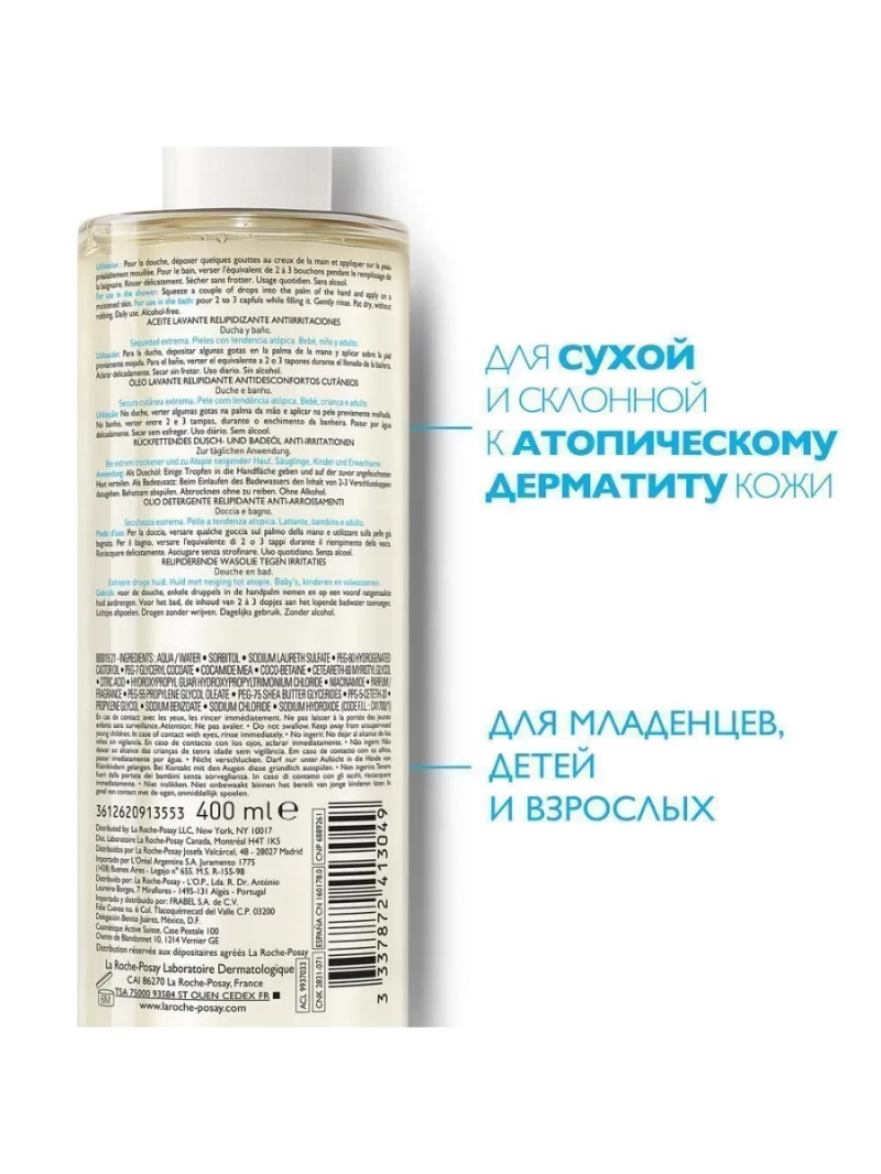 Масло Lipikar АP+ липидовосполняющее смягчающее для ванны и душа 400 мл предназначено для нормальной, склонной к сухости и сухой кожи младенцев, детей и взрослых. Увлажняющее масло для тела питает нежную и чувствительную кожу, восстанавливает ее защитный барьер и предупреждает снижение защитных свойств сухой кожи, обладает противовоспалительным действием. Безопасное и мягкое средство, подходящее для взрослых и детей, включая новорожденных. Термальная вода ЛяРош в составе средства богата селеном и является природным антиоксидантом. Некомедогенный гель для душа обогащен витаминами и натуральными экстрактами для дополнительного увлажнения, которые питают кожу и способствуют восстановлению ее защитного барьера. Уникальный запатентованный ингредиент Aqua Posae Filiformis способствует восстановлению микробиома кожи и укреплению ее защитного барьера. Входящий в состав Ниацинамид успокаивает кожу, даря ей ощущение комфорта, а масло Карите обеспечивает интенсивное восполнение липидов, способствуя уменьшению сухости и ощущения стянутости кожи. Уменьшает сухость кожи на 46%.Налейте небольшое количество ЛИПИКАР МАСЛА на ладонь, вспеньте и нанесите на предварительно смоченную водой кожу. Аккуратно смойте масло водой. Средство идеально подходит для ежедневного использования и обеспечивает интенсивное увлажнение и питание на протяжении длительного времени, делая поврежденную кожу мягкой, гладкой и здоровой. Обеспечивает комфорт и смягчение даже самой сухой, чувствительной и атопичной кожи взрослых, детей и новорожденных младенцев 0+. Безопасная формула средства не вызывает раздражения и не закупоривает поры. Не оставляет липкости и не стягивает кожу после впитывания. Без отдушек и красителей. Протестировано под контролем педиатров и дерматологов. Для всех типов кожи, в том числе кожи, склонной к аллергии и атопии. Откройте для себя французскую аптечную косметику - это идеальное средство ля рош посэй успокаивает и уменьшает ощущение дискомфорта. Ощутимо повышает эластичность кожи!