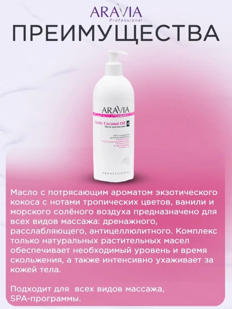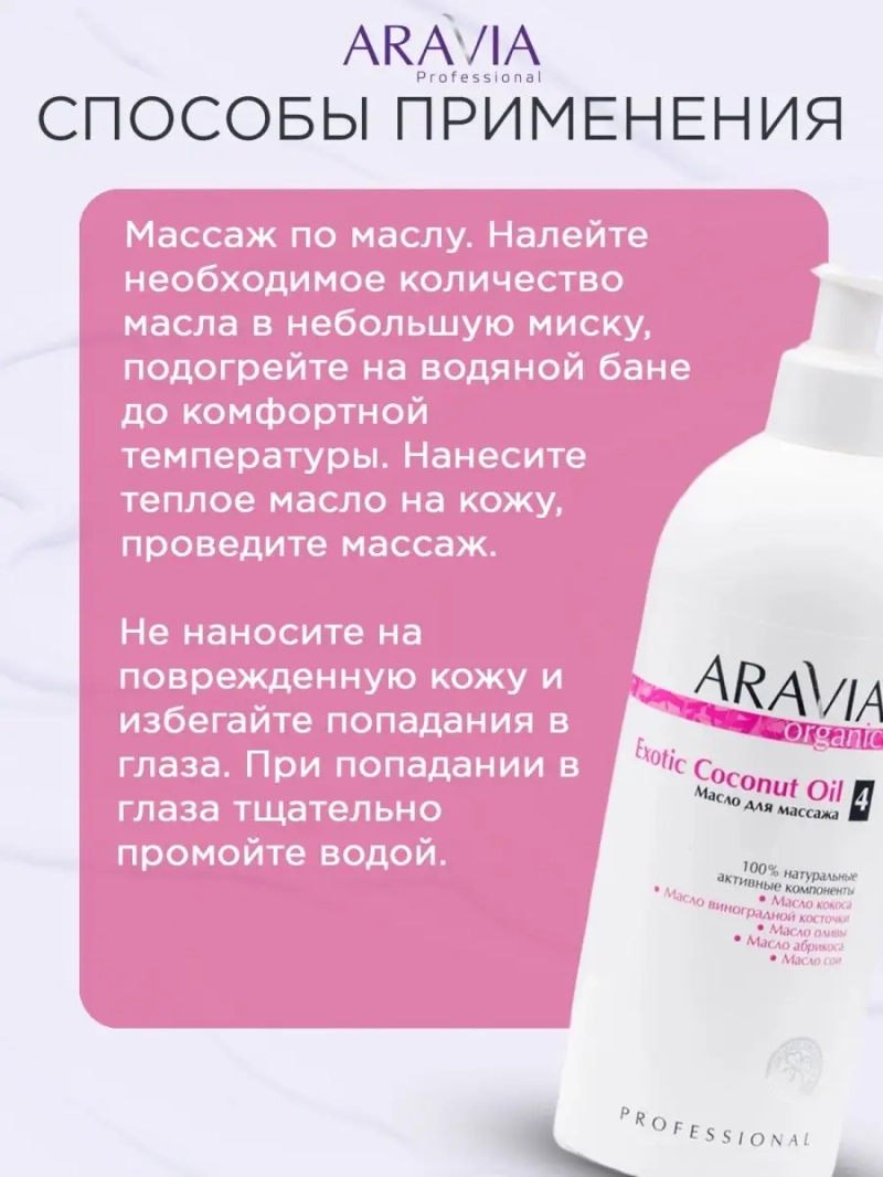 МАСЛО ДЛЯ РАССЛАБЛЯЮЩЕГО МАССАЖА EXOTIC COCONUT OIL, 500 МЛ. Масло с потрясающим ароматом экзотического кокоса с нотами тропических цветов, ванили и морского солёного воздуха предназначено для всех видов массажа: дренажного, расслабляющего, антицеллюлитного. Комплекс только натуральных растительных масел обеспечивает необходимый уровень и время скольжения, а также интенсивно ухаживает за кожей тела. Назначение: все виды массажа, SPA-программы. Рекомендации для использования: Профессиональный уход: массаж по маслу. ДЕЙСТВИЕ: подтягивающее, тонизирующее, расслабляющее, восстанавливающее. Биоактивный состав: масло виноградной косточки, масло кокоса, масло оливы, зеленый чай, масло сои. Состав продукта (INCI): Glycine Soja (Soybean) Oil, Cocos Nucifera (Coconut) Oil, Olea Europaea (Olive) Fruit Oil, Vitis Vinifera (Grape) Seed Oil, Prunus Armeniaca Kernel Oil, BHT, Parfum. СПОСОБ ПРИМЕНЕНИЯ: Массаж по маслу. Налейте необходимое количество масла в небольшую миску, подогрейте на водяной бане до комфортной температуры. Нанесите теплое масло на кожу, проведите массаж. Меры предосторожности: не наносите на поврежденную кожу и избегайте попадания в глаза. При попадании в глаза тщательно промойте водой.