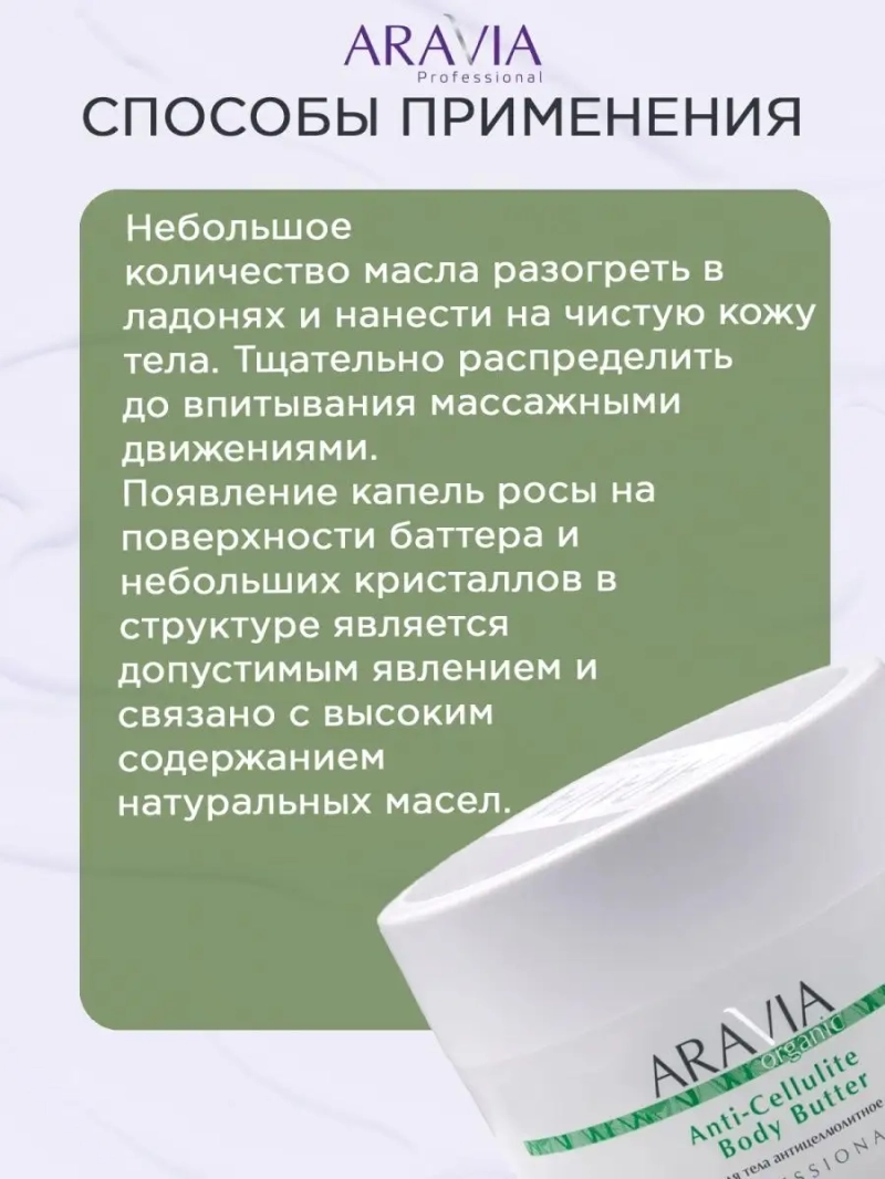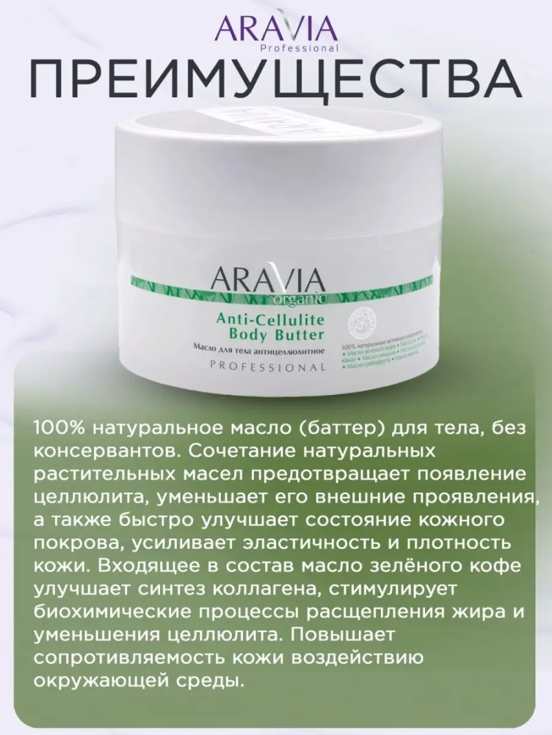 МАСЛО ДЛЯ ТЕЛА АНТИЦЕЛЛЮЛИТНОЕ ANTI-CELLULITE BODY BUTTER, 150 МЛ. 100% натуральное масло (баттер) для тела, без консервантов. Сочетание натуральных растительных масел предотвращает появление целлюлита, уменьшает его внешние проявления, а также быстро улучшает состояние кожного покрова, усиливает эластичность и плотность кожи. Входящее в состав масло зелёного кофе улучшает синтез коллагена, стимулирует биохимические процессы расщепления жира и уменьшения целлюлита. Повышает сопротивляемость кожи воздействию окружающей среды. Назначение: ежедневный уход за кожей тела. Может применяться для массажа. Рекомендации для использования: Профессиональный уход: антицеллюлитный массаж по маслу. Домашний уход: ежедневный уход за кожей при проявлениях целлюлита, локальных жировых отложениях, снижении тургора, сухости кожи. Биоактивный состав: масло зелёного кофе, масло ши, масло какао, масло сладкого миндаля, масло апельсина, масло грейпфрута, масло лимона. Состав продукта (INCI): Coffea arabica L. (green coffee) seed oil, Butyrospermum Parkii (Shea) Butter, Glycine Soja (Soy Bean) Oil, Beeswax, Stearic Acid, Theobroma Cacao (Cocoa) Seed Butter, Sunflower oil, Prunus Armeniaca Kernel Oil, Citrus Sinensis Oil, Lemon (Citrus limon) Essential Oil, Citrus Paradisi. Небольшое количество масла разогреть в ладонях и нанести на чистую кожу тела. Тщательно распределить до впитывания массажными движениями. Появление капель росы на поверхности баттера и небольших кристаллов в структуре является допустимым явлением и связано с высоким содержанием натуральных масел. Меры предосторожности: не наносите на поврежденную кожу и избегайте попадания в глаза. При попадании в глаза тщательно промойте водой.