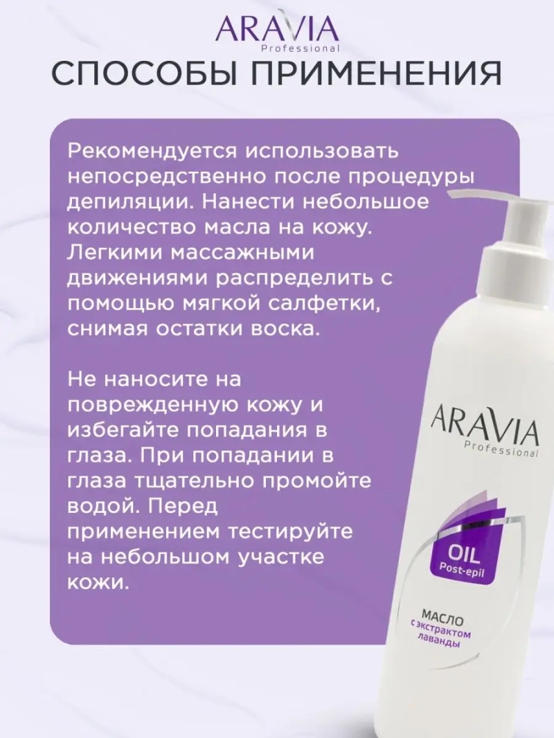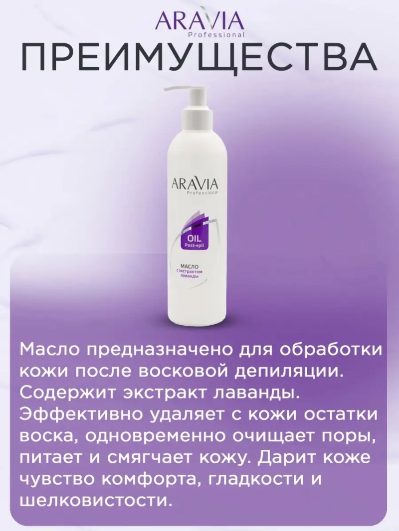 МАСЛО ПОСЛЕ ДЕПИЛЯЦИИ С ЭКСТРАКТОМ ЛАВАНДЫ, 300 МЛ. Масло предназначено для обработки кожи после восковой депиляции. Содержит экстракт лаванды. Эффективно удаляет с кожи остатки воска, одновременно очищает поры, питает и смягчает кожу. Дарит коже чувство комфорта, гладкости и шелковистости. Назначение: очищение кожи после процедуры депиляции. Рекомендации для использования: для профессионального использования. Биоактивный состав: экстракт цветков календулы, масло оливы, масло лаванды. Состав продукта (INCI): Mineral Oil, Сalendula Officinalis Flower, Ethylhexyl Cocoate, Olea Europaea (Olive) Fruit Oil, Lavandula Angustifolia (Lavender) Oil, ВНТ, Bisabolol. СПОСОБ ПРИМЕНЕНИЯ: Рекомендуется использовать непосредственно после процедуры депиляции. Нанести небольшое количество масла на кожу. Легкими массажными движениями распределить с помощью мягкой салфетки, снимая остатки воска. Меры предосторожности: не наносите на поврежденную кожу и избегайте попадания в глаза. При попадании в глаза тщательно промойте водой. Перед применением тестируйте на небольшом участке кожи.