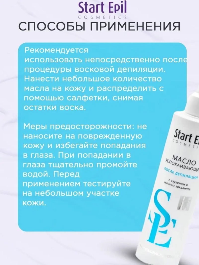 МАСЛО ПОСЛЕ ДЕПИЛЯЦИИ УСПОКАИВАЮЩЕЕ, 200 МЛ. Масло успокаивающее предназначено для обработки кожи после восковой депиляции, быстро удаляет с кожи остатки воска, эффективно очищает поры. Азулен оказывает заживляющее и успокаивающее действие, снимает покраснение и раздражение кожи. Эвкалипт, обладая антисептическими свойствами, способствует быстрому восстановлению кожи после депиляции. Назначение: очищение кожи лица и тела после процедуры депиляции. Рекомендации для использования: для профессионального использования. Биоактивный состав: масло оливы, бисаболол, экстракт ромашки, масло эвкалипта. Состав продукта (INCI): Mineral oil, Olea Europaea (Olive) Fruit oil, Bisabolol, BHT, Chamomilla Recutita Flower Extract, Eucalyptus oil, Parfum. СПОСОБ ПРИМЕНЕНИЯ: Рекомендуется использовать непосредственно после процедуры восковой депиляции. Нанести небольшое количество масла на кожу и распределить с помощью салфетки, снимая остатки воска. Меры предосторожности: не наносите на поврежденную кожу и избегайте попадания в глаза. При попадании в глаза тщательно промойте водой. Перед применением тестируйте на небольшом участке кожи.