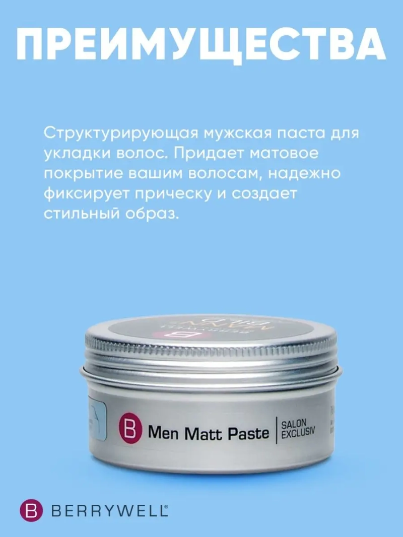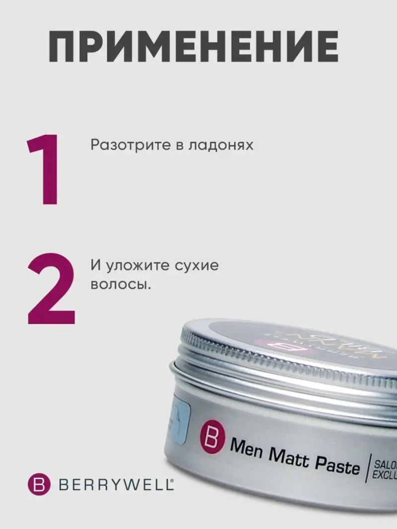 Матовая паста для мужчин Men Matt Paste BERRYWELL 76 мл. Структурирующая мужская паста для укладки волос. Придает матовое покрытие вашим волосам, надежно фиксирует прическу и создает стильный образ. Применение: Разотрите в ладонях и уложите сухие волосы.