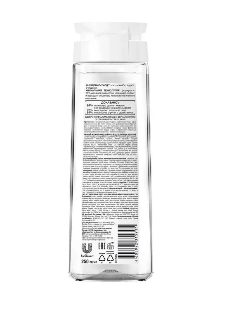 Удаление макияжа и очищение лица должны входить в обязательный уход за кожей лица. Косметика Черный Жемчуг поможет избежать шелушения и сухости, а также восстановить естественный водный баланс. Бренд стоял у истоков создания рынка уходовых средств в России и теперь занимает лидирующие позиции. Продукты Черный Жемчуг максимально эффективны, поэтому любимы миллионами женщин. Черный Жемчуг Очищение + Уход мицеллярная вода для лица, век и губ, 250 мл обеспечивает качественное снятие макияжа. Средство не щиплет глаза, успокаивает и увлажняет уже с первой секунды после нанесения. Благодаря активным компонентам мицеллярка обеспечивает качественный уход за кожей лица уже во время очищения. В состав входят гиалурон, экстракт камелии и 20 % сыворотка с коллагеном. Гиалуроновая кислота для лица необходима для интенсивного питания клеток и восстановления естественного уровня pH. Жидкий коллаген делает кожу шелковистой и мягкой, а камелия снимает воспаление. Как результат — здоровый блеск и ровный тон лица. Мицеллярная вода удаляет даже стойкий макияж всего за одно движение.
