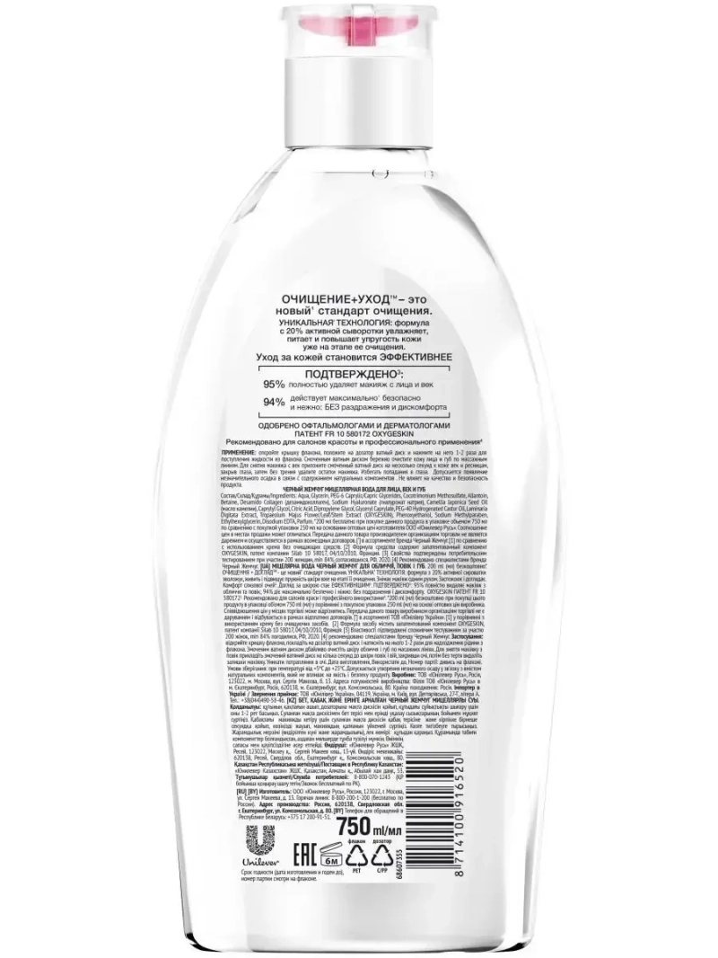 Черный Жемчуг мицеллярная вода для чувствительной кожи Очищение +Уход, 750 мл обеспечивает тщательное удаление макияжа всего за одно движение. Она не щиплет глаза, успокаивает и дарит комфорт с первой секунды после нанесения. Средство содержит 20 % активного жидкого коллагена, гиалурон и экстракт камелии. Активные компоненты обеспечивают бережный уход за кожей и интенсивное увлажнение. Гиалуроновая кислота для лица выступает в качестве источника дополнительного питания. Также она удерживает влагу в клетках, помогает избавиться от раздражения и шелушения. Коллаген повышает упругость, а экстракт камелии отвечает за насыщение клеток витаминами и эффективное очищение кожи. Мицеллярная вода для лица имеет уникальный дозатор: всего одно нажатие — и можно приступать к снятию туши, помады и другой косметики. Это обеспечивает легкость при использовании средства, а большой флакон — экономичный расход и длительный уход за кожей лица. Мицеллярная вода справится даже с водостойким макияжем. Для демакияжа смочите жидкостью ватный диск и ненадолго приложите его к векам или ресницам. Мягко помассируйте кожу и удалите тушь. Избегайте попадания средства в глаза!