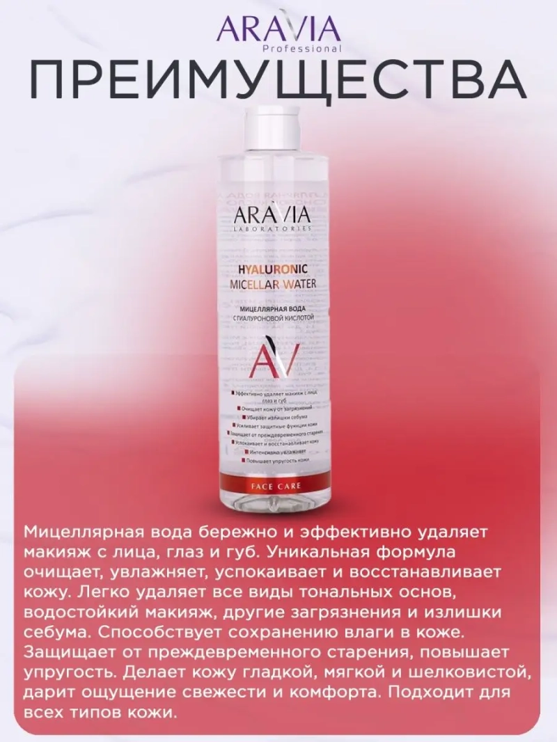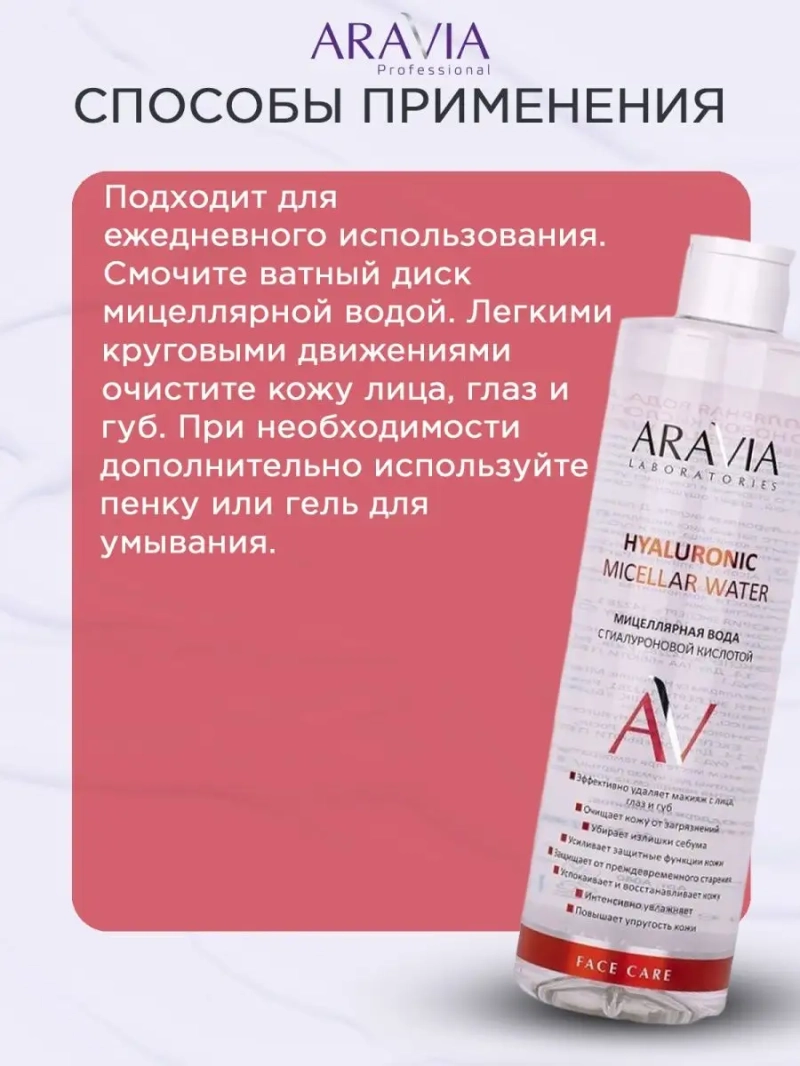 МИЦЕЛЛЯРНАЯ ВОДА С ГИАЛУРОНОВОЙ КИСЛОТОЙ HYALURONIC MICELLAR WATER, 520 МЛ. Мицеллярная вода бережно и эффективно удаляет макияж с лица, глаз и губ. Уникальная формула очищает, увлажняет, успокаивает и восстанавливает кожу. Легко удаляет все виды тональных основ, водостойкий макияж, другие загрязнения и излишки себума. Способствует сохранению влаги в коже. Защищает от преждевременного старения, повышает упругость. Делает кожу гладкой, мягкой и шелковистой, дарит ощущение свежести и комфорта. Подходит для всех типов кожи. Назначение: очищение, демакияж. Рекомендации по использованию: для ежедневного использования. ДЕЙСТВИЕ: успокаивающее, восстанавливающее, увлажняющее, удаляет макияж, убирает излишки себума. Биоактивный состав: гиалуроновая кислота, Д-пантенол. Гиалуроновая кислота — способствует глубокому увлажнению кожи, образует в поверхностных слоях эпидермиса влагоудерживающий барьер, смягчающий и разглаживающий кожу. Д-пантенол — обладает увлажняющим, заживляющим, смягчающим и разглаживающим действием. Делает кожу более эластичной, оказывает успокаивающее действие. СПОСОБ ПРИМЕНЕНИЯ: Смочите ватный диск мицеллярной водой. Легкими круговыми движениями очистите кожу лица, глаз и губ. При необходимости дополнительно используйте пенку или гель для умывания. Меры предосторожности: не наносите на поврежденную кожу и избегайте попадания в глаза. При попадании в глаза тщательно промойте водой. Перед применением тестируйте на небольшом участке кожи.