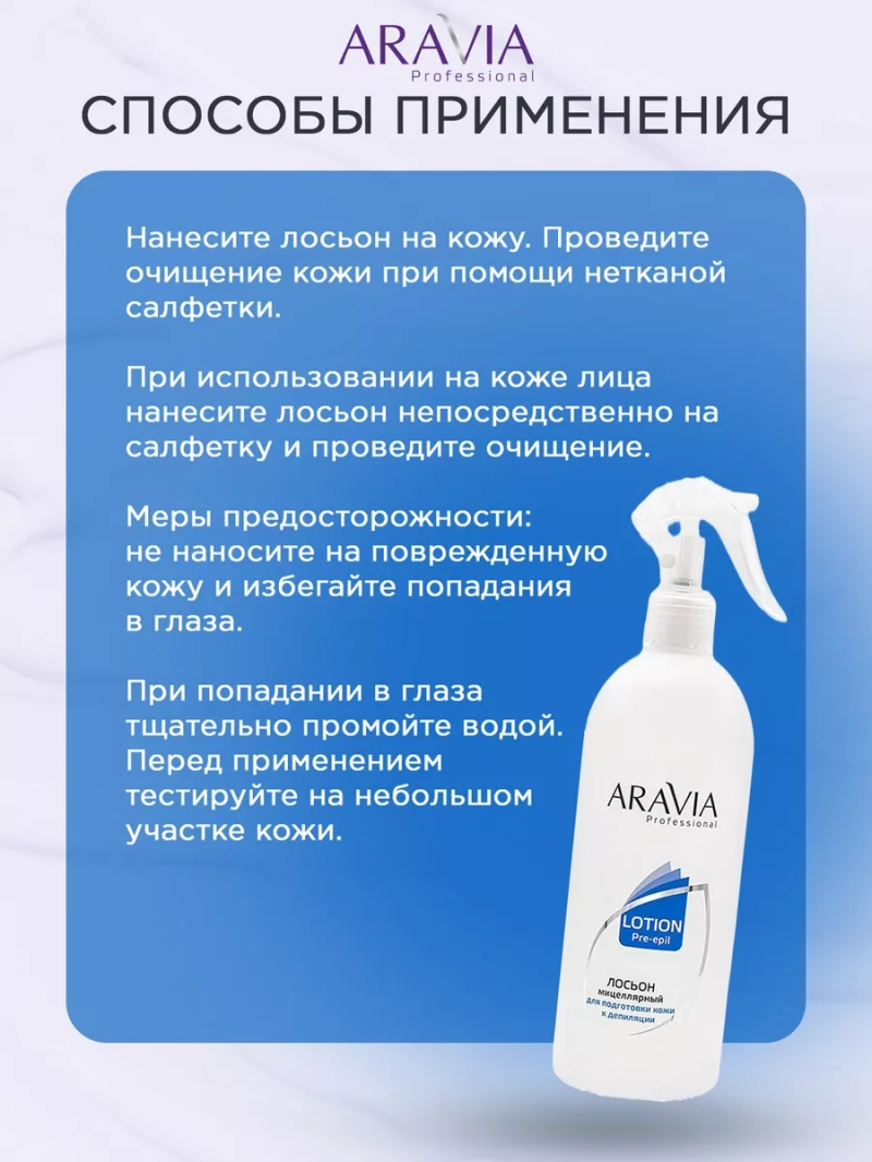 Лосьон мицеллярный перед депиляцией 500 мл. Мицеллярный лосьон предназначен для очищения и подготовки кожи к депиляции. Мягко обезжиривает кожу, не нарушая рН-баланс, предупреждает появление раздражений и покраснений. Быстро и эффективно удаляет загрязнения, остатки дезодоранта и макияж. Сбалансированная формула оказывает противовоспалительное, смягчающее действие. Идеально подходит для чувствительной кожи. Назначение: очищение кожи перед процедурой депиляции. Рекомендации для использования: для профессионального использования. Биоактивный состав: мочевина, пантенол, мягкие ПАВ. Состав продукта (INCI): Aqua, Glycerin, Urea, Propylene Glycol, Sodium Laureth-11 Carboxylate, Panthenol, DMDM Hydantoin, Iodopropynyl Butylcarbamate, Parfum, Disodium EDTA. Способ применения: Нанесите лосьон на кожу. Проведите очищение кожи при помощи нетканой салфетки. При использовании на коже лица нанесите лосьон непосредственно на салфетку и проведите очищение. Меры предосторожности: не наносите на поврежденную кожу и избегайте попадания в глаза. При попадании в глаза тщательно промойте водой. Перед применением тестируйте на небольшом участке кожи.