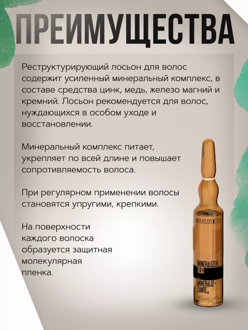 Минеральное масло Artistic Flair Olio Miniralizer от итальянского бренда профессиональной косметики SELECTIVE Professional разработано для комплексного восстанавливающего ухода за всеми видами поврежденных волос. Это уникальное СОС - средство для особо травмированных волос, в основе которого лежат органические масло, витамины и минералы. Реструктурирующий тоник имеет выраженные восстанавливающие и защитные свойства и усиленно работает на особо поврежденных участках волос. Филлер глубоко увлажняет и питает кутикулу волоса, наполняя ее недостающими микроэлементами и аминокислотами. Комплекс олигоэлементов оказывает направленное действие на ослабленные пряди и наполняет их силой и красотой. Минеральные масла окутывают каждый волос невесомой молекулярной пленкой, чем защищает от механический повреждений и неблагоприятного воздействия окружающей среды. Эко – продукт содержит УФ – фильтры с антиоксидантными свойствами. Лосьон поддерживает водный баланс и препятствует потере питательных веществ. Регенерирующий бальзам придает волосам густоту, мягкость и удивительную гибкость.Сыворотка с сильным питательным эффектом на клеточном уровне интенсивно восстанавливает ослабленную структуру хрупких волос, придает тонус и упругость. Упаковка ампул выполнена из темного стекла, что обеспечивает длительную сохранность компонентов. Каждая ампула содержит оптимальное количество средства для одной процедуры.Содержимое одной ампулы необходимо нанести на чистые подсушенные волосы, равномерно распределить и прочесать гребнем с частыми зубцами. Оставить на 5-10 минут. Можно использовать дополнительное тепло. Тщательно смыть большим количеством теплой воды и приступить к дальнейшей укладке.Средство быстро впитывается, не оставляет жирной пленки и не утяжеляет. Только для наружного применения.Имеет накопительный эффект.Продукт предназначен для использования в домашних условиях, а также в салонах красоты и парикмахерских.ОЛИО МИНИРАЛАЙЗЕР – прост в применении, эффективен в действии.