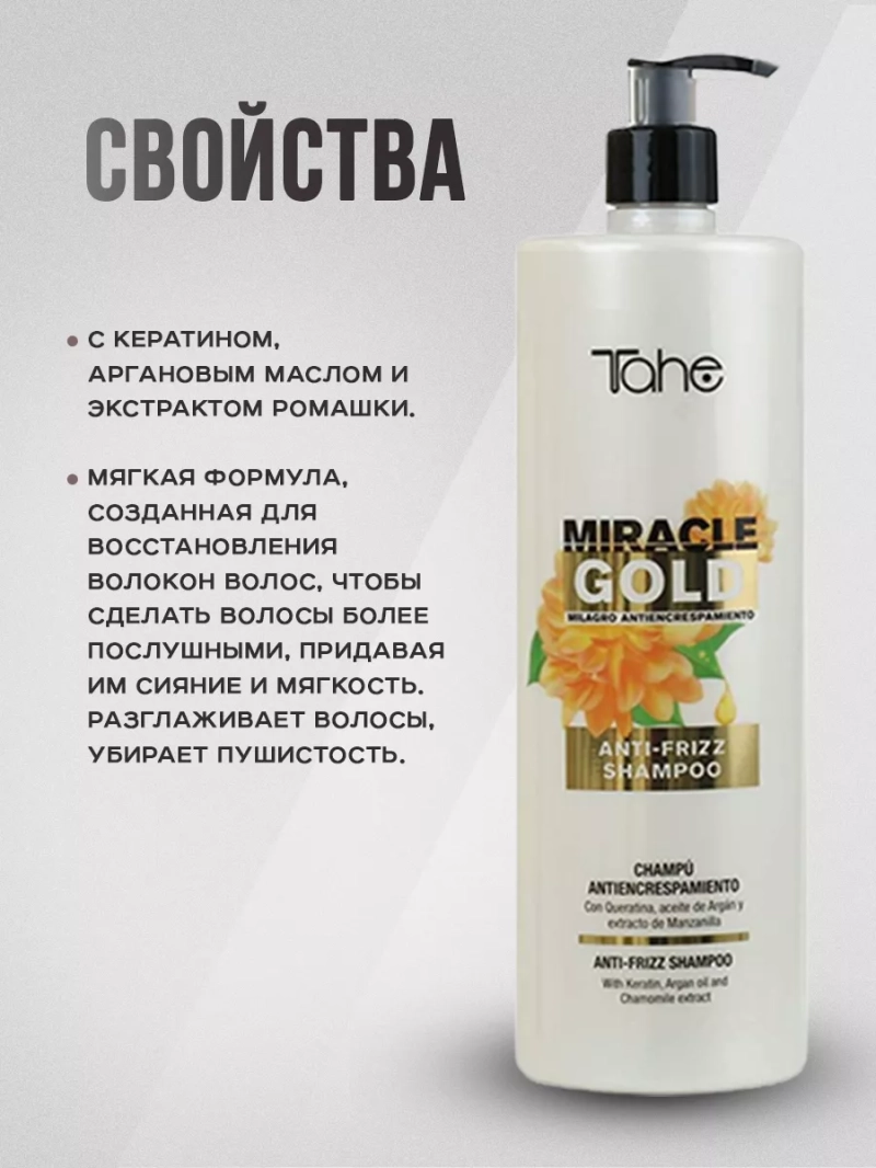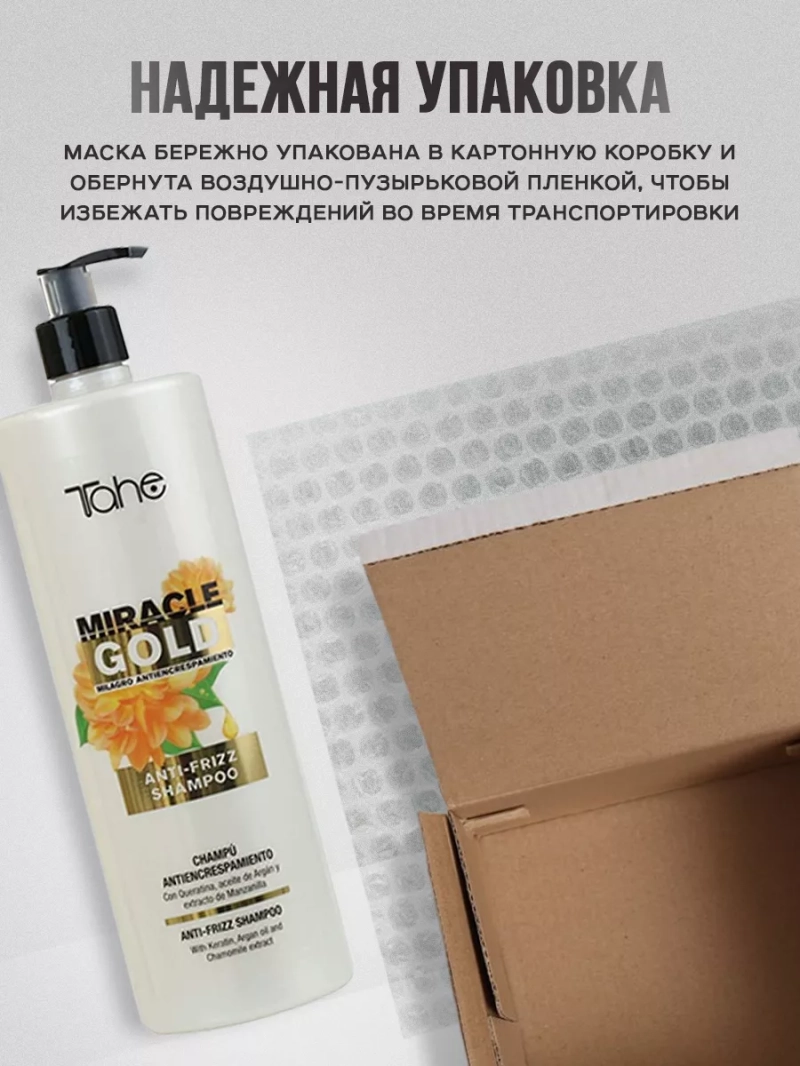 Маска для плотных волос Miracle Gold Anti-Frizz Mask от бренда Tahe станет настоящим чудом для ваших волос, помогая избавиться от неприятного пушистого эффекта и придать им здоровый блеск и шелковистость.