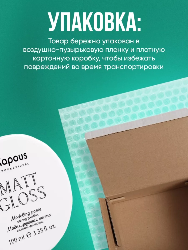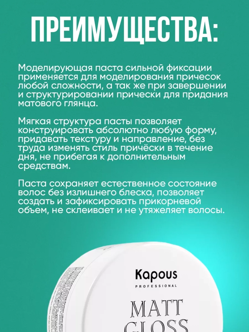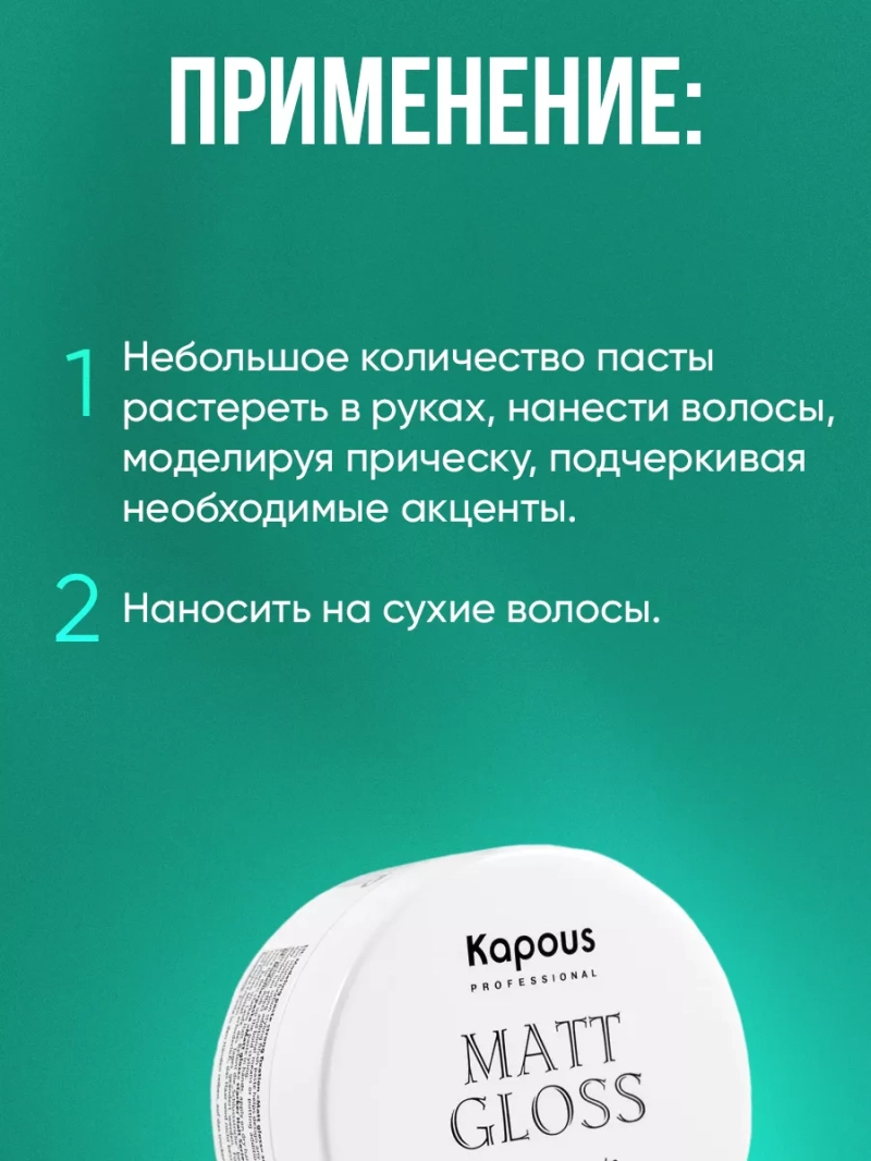 Моделирующая паста для волос сильной фиксации "Matt Gloss" применяется для моделирования причесок любой сложности, а так же при завершении и структурировании прически для придания матового глянца. Мягкая структура пасты позволяет конструировать абсолютно любую форму, придавать текстуру и направление, без труда изменять стиль причёски в течение дня, не прибегая к дополнительным средствам. Паста сохраняет естественное состояние волос без излишнего блеска, позволяет создать и зафиксировать прикорневой объем, не склеивает и не утяжеляет волосы. Также рекомендована для создания дредов и эффекта взъерошенных или не уложенных волос. Паста сильной фиксации для завершения укладки позволяет конструировать любую форму, придавать текстуру, изменять стиль причёски в течение дня, не прибегая к дополнительным средствам, не утяжеляя волосы. Рекомендована для создания дредов. Используется для всех типов волос. Легко смывается шампунем. Активные ингредиенты: Канделильский воск (Candellila Wax) является натуральной основой, эффективно увлажняет и защищает волосы от обезвоживания. Натуральный углеводный полимер (Tribehenin) смягчает волосы, утолщает их без эффекта склеивания. Специализированные катионные полимеры (Polyquatemium) придают эластичность и фиксацию волосам. Белая глина (Kaolin) - придают матовый эффект. Способ применения: небольшое количество пасты растереть в руках, нанести волосы, моделируя прическу, подчеркивая необходимые акценты. Наносить на сухие волосы. Состав: AQUA, PETROLATUM, KAOLIN, CETEARYL ALCOHOL, ALCOHOL DENAT., GLYCERYL STEARATE, PROPYLENE GLYCOL, PEG-100 STEARATE, CETEARETH-25, VP/VA COPOLYMER, COPERNICIA CERIFERA CERA, PHENOXYETHANOL, MAGNESIUM ALUMINUM SILICATE, PARFUM, PEG-150 DISTEARATE, ETHYLHEXYLGLYCERIN, CITRONELLOL, GERANIOL, HEXYL CINNAMAL, LIMONENE, CI 77499.