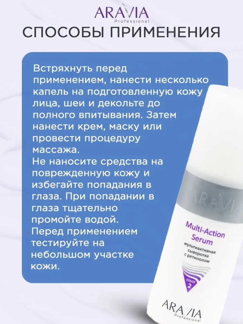 МУЛЬТИАКТИВНАЯ СЫВОРОТКА С РЕТИНОЛОМ MULTI-ACTION SERUM, 150 МЛ. Сыворотка с высокой концентрацией витаминно-антиоксидантного комплекса с ретинолом (1%) ускоряет процесс обновления и эпителизации клеток кожи, обладает восстанавливающим эффектом. Регулирует процесс полиферации клеток, снимает гиперкератоз, эффективно борется с последствиями фотостарения кожи, способствует сокращению морщин. Восстанавливает эластичность кожи. Назначение: интенсивный уход за увядающей кожей в рамках профессиональных процедур. Рекомендации для использования: Профессиональный уход: нанесение перед маской, массажем, на завершающем этапе под защитный крем. Домашний уход: по назначению косметолога. Биоактивный состав: витамины А, Е, F, натуральный увлажняющий фактор, масло виноградной косточки, миндальное, оливковое, глицерин. Состав продукта (INCI): Aqua, Ethyl ethers of unsaturated faty acids (Linoleic acid and Linolenic acid) and Vitamin A Palmitate Care and Vitamin E Acetate Care, Olea Europaea (olive) Fruit Oil, Potassium Cetyl Phosphate, Urea, Glycerin, Vitus Vinifera (Grape) Seed Oil, Prunus Amygdalus Dulcis (Sweet Almond) Oil, Aqua and Glucose and Sorbitol and Sodium Glutamate and Urea and Sodium PCA and Glycine and Lactic Acid and Hydrolyzed Wheat Protein and Panthenol, Dimethicone, Sodium acrylates copolymer, Lecithin, Ceteareth-20, Phenoxyethanol (and) Ethylhexylglycerin. СПОСОБ ПРИМЕННЕНИЯ: Встряхнуть перед применением, нанести несколько капель на подготовленную кожу лица, шеи и декольте до полного впитывания. Затем нанести крем, маску или провести процедуру массажа.Меры предосторожности: не наносите средства на поврежденную кожу и избегайте попадания в глаза. При попадании в глаза тщательно промойте водой. Перед применением тестируйте на небольшом участке кожи.