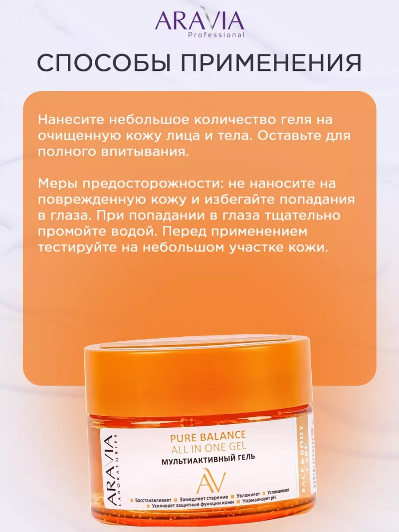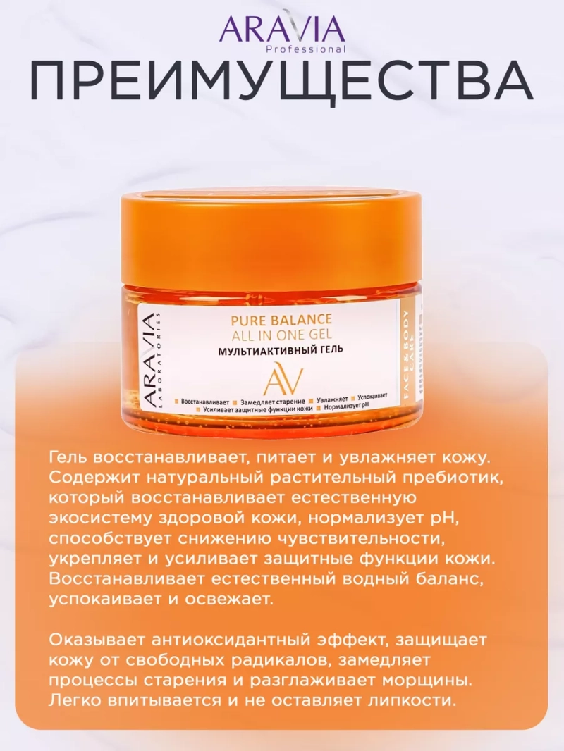 МУЛЬТИАКТИВНЫЙ ГЕЛЬ PURE BALANCE ALL IN ONE GEL, 250 МЛ. Гель восстанавливает, питает и увлажняет кожу. Содержит натуральный растительный пребиотик, который восстанавливает естественную экосистему здоровой кожи, нормализует pH, способствует снижению чувствительности, укрепляет и усиливает защитные функции кожи. Восстанавливает естественный водный баланс, успокаивает и освежает. Оказывает антиоксидантный эффект, защищает кожу от свободных радикалов, замедляет процессы старения и разглаживает морщины. Легко впитывается и не оставляет липкости. Назначение: для ежедневного ухода за кожей лица и тела, а также для ухода после пилинга, депиляции, солнечных ванн, посещения солярия и фитнес-центра. Рекомендации для использования: Профессиональный уход: может использоваться как основа для аппаратных методов в косметологии. Домашний уход: 1-2 раза в день. Биоактивный состав: комплекс пребиотиков, экстракт опунции, аллантоин, Д-пантенол. Комплекс пребиотиков восстанавливает естественную экосистему здоровой кожи, регулирует естественное соотношение микрофлоры на поверхности кожи, а также восстанавливает нормальный рН. Обеспечивает укрепление и усиление защитных функций кожи, ее сопротивляемость окружающим стрессам, снижает проницаемость кожного покрова для болезнетворных и вредных микроорганизмов. Тем самым уменьшается чувствительность кожи и снижается риск возникновения проблем, появляющихся в результате воздействия неблагоприятных факторов внешней среды. Обладает противовоспалительными свойствами. Успокаивает раздраженную кожу. Восстанавливает и освежает. Д-пантенол увлажняет, смягчает и успокаивает кожу. Обладает заживляющим и разглаживающим свойствами. Делает кожу более эластичной. СПОСОБ ПРИМЕНЕНИЯ: Нанесите небольшое количество геля на очищенную кожу лица и тела. Оставьте для полного впитывания. Не наносите на поврежденную кожу и избегайте попадания в глаза. При попадании в глаза тщательно промойте водой. Перед применением тестируйте на небольшом участке кожи.