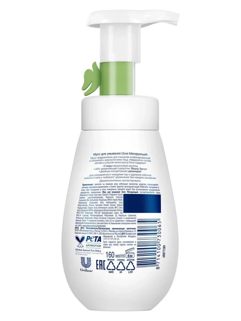 Полное наименование: DOVE Мусс для умывания матирующий 160 мл. Производитель: Unilever Россия. Идеально гладкая, нежная и ухоженная кожа – неизменное олицетворение красоты в Азии уже более тысячи лет. Правильный уход за кожей – это главное оружие японских женщин. Именно поэтому азиатские ритуалы ухода – это мировой тренд, не теряющий свою актуальность и растущий из года в год. Специально для вас Dove, совместно с японскими специалистами, разработал линейку средств для ежедневного ухода за кожей, призванную бережно очищать кожу лица и заботиться о ней. Одно из таких средств - Увлажняющий мусс для умывания Dove. Матирующий мусс для умывания Dove предназначен для очищения кожи лица. Продукт подходит для комбинированной и склонной к жирности кожи с расширенными порами. Для создания густого мусса достаточно одного нажатия. Густая и упругая пена содержит миллионы мельчайших пузырьков, обогащенных экстрактом гамамелиса вирджинского, для нежного удаления загрязнений и избытка кожного сала из пор. Система мягких ПАВных компонентов в составе мусса эффективно очищает, а концентрированная сыворотка NutriumMoistureТМ Beauty Serum и витамин Е глубоко** увлажняет кожу при каждом умывании, оставляя ее мягкой и гладкой. Кроме того, состав Увлажняющего мусса для умывания Dove обогащен церамидами, которые восстанавливают и поддерживают липидный барьер кожи. Просто нанесите на влажную кожу небольшое количество средства, помассируйте легкими круговыми движениями и смойте средство прохладной водой. Результат – после каждого использования поры становятся чистыми, кожа – матовой без ощущения липкости! Не содержит спирта. Dove не тестируется на животных во всем мире. *в пределах эпидермиса