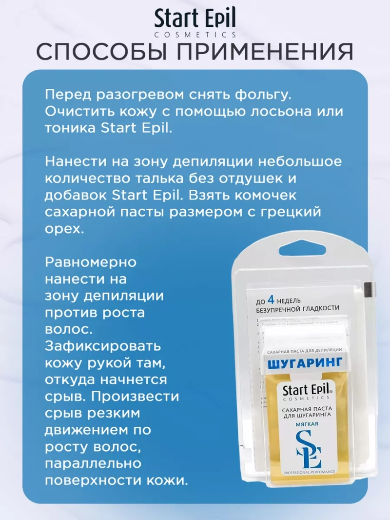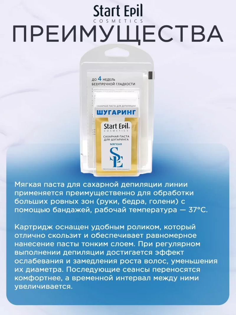 НАБОР ПАСТА В КАРТРИДЖЕ «МЯГКАЯ» 100 Г + БУМАЖНЫЕ ПОЛОСКИ. Мягкая паста для сахарной депиляции линии применяется преимущественно для обработки больших ровных зон (руки, бедра, голени) с помощью бандажей, рабочай температура — 37°С. Картридж оснащен удобным роликом, который отлично скользит и обеспечивает равномерное нанесение пасты тонким слоем. При регулярном выполнении депиляции достигается эффект ослабевания и замедления роста волос, уменьшения их диаметра. Последующие сеансы переносятся комфортнее, а временной интервал между ними увеличивается. Гипоаллергенный продукт. Назначение: удаление нежелательных волос. Рекомендации для использования: для профессионального использования. СПОСОБ ПРИМЕНЕНИЯ: Снять защитную пленку с картриджа. Разогреть пасту в микроволновой печи в течение 10 секунд при мощности 800W. Раскатать ролик картриджа на полоске. Проверить комфортность температуры сахарной пасты. Обезжирить кожу с помощью лосьона или тоника. Нанести косметический тальк на зону депиляции. Нанести сахарную пасту роликом на небольшой участок кожи по направлению против роста волос. Приложить на нанесенную дорожку сахарной пасты полоску. Прижать для более крепкого сцепления. Зафиксировать кожу рукой там, откуда начнется срыв. Срыв бандажа проводить резким движением, строго параллельно коже по направлению роста волос. Удалить остатки сахарной пасты термальной водой. Нанести на кожу увлажняющее молочко или питательные сливки. Для повышения эффективности проведения процедуры депиляции на всех этапах рекомендуется использовать линейку средства Start Epil. Меры предосторожности: не наносите на поврежденную кожу и избегайте попадания в глаза. При попадании в глаза тщательно промойте водой. Перед применением тестируйте на небольшом участке кожи.