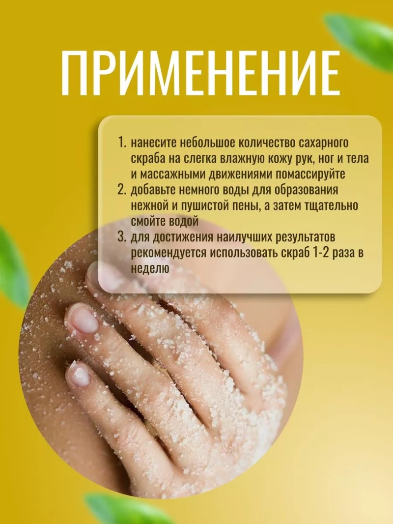 Натуральный сахарный скраб для нежного отшелушивания – это идеальное решение для вашего ухода за кожей. Сахарный скраб (Ананас) подарит вашей коже нежность и ухоженный вид, благодаря чему она будет выглядеть здоровой и сияющей. Если вы ищете способ вернуть коже бархатистость, наш натуральный сахарный скраб станет вашим незаменимым помощником. С уникальной формулой, содержащей натуральный экстракт ананаса, этот скраб эффективно удаляет отмершие клетки кожи, а также глубоко увлажняет ее. Каждое применение скраба – это настоящий эликсир молодости и красоты, который наполняет вашу кожу сиянием и свежестью. Не стоит беспокоиться, если у вас есть признаки аллергической реакции, такие как зуд или раздражение. Мы заботимся о каждом клиенте, и в нашем сахарном скрабе (Ананас) содержатся активные ингредиенты, способные бороться с пигментными пятнами и увлажнять кожу. Сахарный скраб помогает расслабиться и насладиться процессом ухода: ваша кожа станет более упругой и эластичной, а пигментация станет менее заметной. Аромат ананаса пробуждает чувство свежести и дарит незабываемые ощущения. С первой же процедуры вы ощутите, как ваша кожа наполняется фруктовой эйфорией и выглядит роскошной. Мы используем только высококачественные натуральные ингредиенты, такие как сахар, глицерин и масла виноградной косточки и персикового ядра. Эти компоненты не только отшелушивают, но и питают кожу, возвращая ей здоровое сияние. Применять наш скраб очень просто: нанесите небольшое количество на слегка влажную кожу и массируйте. Для образования нежной пены добавьте немного воды, затем тщательно смойте. Рекомендуется использовать скраб 1-2 раза в неделю для достижения наилучших результатов. Почувствуйте тот настоящий уход и любовь, которые мы вкладываем в каждый продукт. Натуральный сахарный скраб для нежного отшелушивания – это не просто косметическое средство, это ваша роскошь, которая подарит вам незабываемые моменты удовольствия и прекрасные ощущения. Не откладывайте заботу о своей коже!