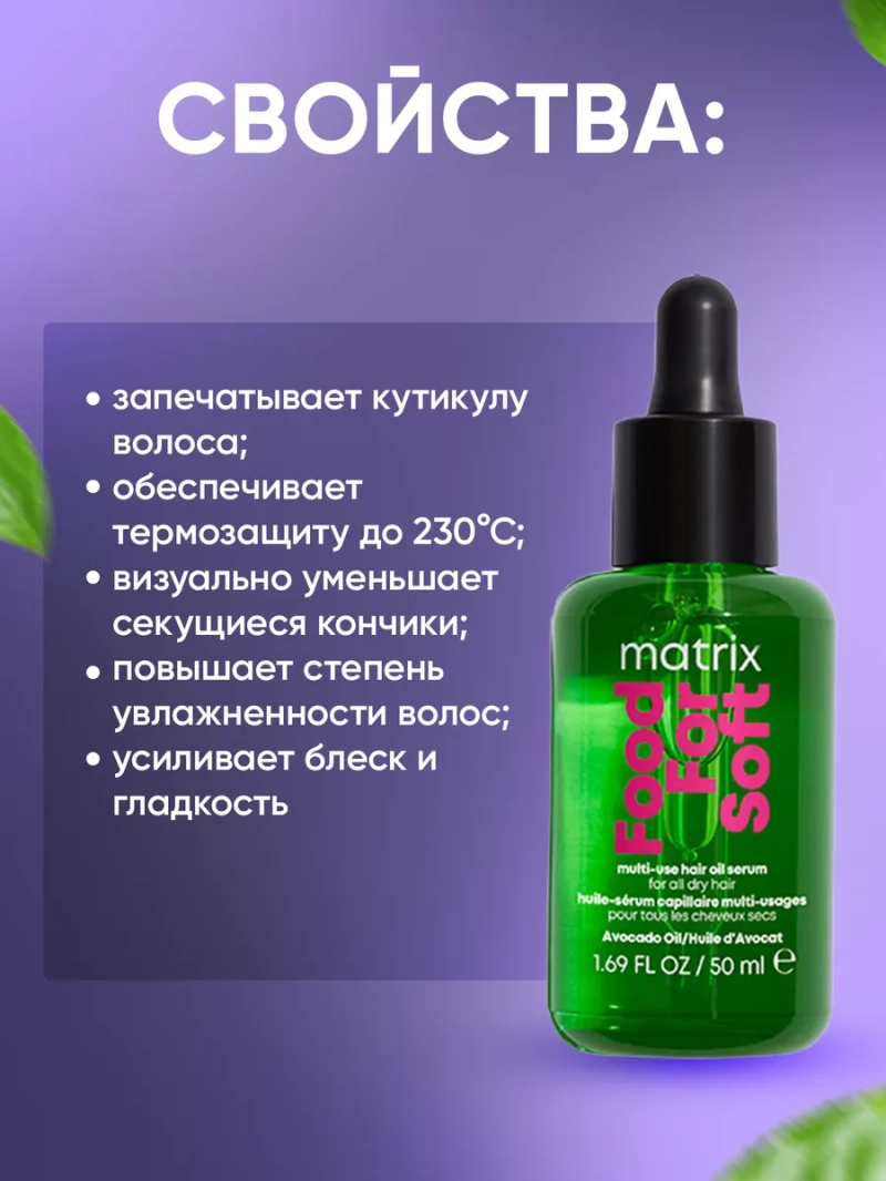 Многофункциональное масло - сыворотка для глубокого и интенсивного увлажнения сухих, ломких, пористых и поврежденных волос L'Oreal Matrix Food For Soft рекомендуется всем, кто имеет проблемные и непослушные натуральные и окрашенные волосы. Использование приборов для укладки на высоких температурах, частые окрашивания нередко является причиной того, что волосы становятся жесткими и безжизненными. Гамма Фуд фо Софт предназначена для интенсивного увлажнения, питания и распутывания всех типов сухих и поврежденных волос, а также волос с высокой пористостью. Специальная формула средств делает волосы гладкими, мягкими, блестящими и шелковистыми. Высокое содержание гиалуроновой кислоты на молекулярном уровне глубоко увлажняет кудрявые и волнистые пряди и восстанавливает водный баланс. Масло авокадо предотвращает потерю влаги и делает ослабленные и истонченные пряди более приятными на ощупь. Масло Матрикс Фуд фо Софт дополняет и усиливает действие шампуня и кондиционера для сухих волос. Жидкая сыворотка бережно запечатывает кутикулу каждого волоса и эффективно удерживает влагу внутри. Средство проникает в клетки волосяных луковиц, восстанавливает их структуру, возвращает природную силу и здоровье, устраняет сухость, сечение и ломкость. Специальная формула масла насыщает волосы витаминами и минералами, запускает обменные процессы в клетках волос, оздоравливает и укрепляет по всей длине. Рекомендуется наносить несколько капель несмываемого средства на чистые влажные или сухие волосы после использования шампуня и кондиционера (бальзама – ополаскивателя). Несмываемое средство обеспечивает надежную термозащиту до 230C, предотвращает электризацию волос, имеет антистатический эффект. Прозрачное масло легко распределяется, быстро впитывается, но не оставляет липкости и жирности на светлых, темных и рыжих волосах. Профессиональное масло МАТРИКС можно использовать для всей семьи: как мужской, женский или подростковый вариант ежедневного ухода за всеми типами тонких и густых волос.