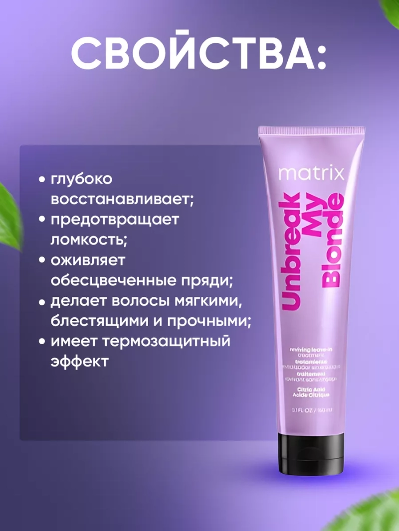 Часто после процедур обесцвечивания, осветления и мелирования ухудшается качество волос. Они выглядят сухими, безжизненными, тусклыми, появляется ломкость и секущиеся кончики. Профессиональная гамма L'Oreal Matrix Total Result Unbreak My Blonde (Тотал Резалтс Анбрейк май Блонд) создана для укрепления и восстановления осветленных волос любых типов. Линейка является идеальной серией ухода для блондинок, но отлично работает на окрашенных, мелированных, седых, осветленных, поврежденных волосах, всех оттенках блонда и после бондинга (бонда). Может использоваться на жестких седых и натуральных волосах светлых и светло - русых оттенков.