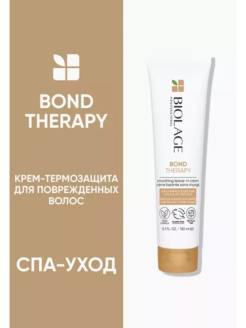 Несмываемый крем-термозащита для поврежденных волос Biolage Bond Therapy (Биолаж Бонд Терапи), 150 мл, — интенсивный укрепляющий и разглаживающий уход, придающий блеск волосам. Веган-формула крема с лимонной кислотой и маслом кокоса защищает от термического воздействия до 230 °C, делает волосыболее гладкими и более сильными. После применения волосы путаются в 3 раза меньше. Несмываемый уход для волос Биолаж — завершающий этап профессиональной рутины Бонд Терапи. Кремовое средство ухаживает за волосами, снижает пушение, обеспечивает легкую и безопасную укладку. Лимонная кислота в составе крема восстанавливает структуру кортекса и повышает его устойчивость к повреждениям. Масло кокоса питает и разглаживает, защищает волосы на поверхности кутикулы, дарит им сияние, мягкость и гладкость. Насладитесь атмосферой спа-салона у себя дома: культовый аромат Biolage, построенный на принципах ароматерапии, поднимает настроение, помогает избавиться от напряжения и стресса. Оцените восстанавливающие свойства Bond Therapy от Biolage в комплексном уходе. Шаг 1: пре-уход сокращает ломкость волос и секущиеся кончики. Шаг 2: шампунь деликатно очищает. Шаг 3: кондиционер укрепляет и разглаживает волосы. Шаг 4: несмываемый крем-термозащита придает блеск, облегчает укладку и обеспечивает защиту от температур до 230 °C. Эликсир совмещает в себе действие укрепляющей маски и сыворотки — глубоко питает и разглаживает локоны, дает мягкость и восстановление поврежденным, ломким и сухим прядям. Несмываемый бальзам предотвращает сухость, ломкость и сечение, также имеет антистатический эффект и препятствует электризации. Формула без парабенов подходит для всех типов поврежденных волос (осветленные, обесцвеченные, окрашенные, пушащиеся, после химической завивки или химического выпрямления, подверженные регулярным термоукладкам утюжком и феном).Способ применения: нанести термозащитный флюид антистатик на чистые, подсушенные полотенцем волосы по всей длине, отступив от корней.