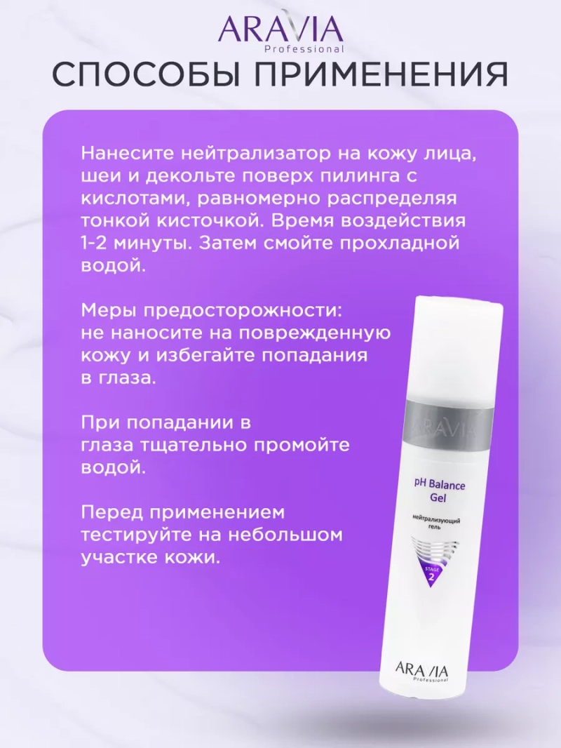 НЕЙТРАЛИЗУЮЩИЙ ГЕЛЬ РН BALANCE GEL, 250 МЛ. Нейтрализующий гель для кожи. Применяется для нормализации рН-баланса кожи при проведении химических пилингов с кислотами. Успокаивает кожу, препятствуя появлению покраснений и раздражений. Быстро снимает неприятные ощущения, вызванные воздействием кислот. Рекомендуется для нейтрализации всех видов кислотных пилингов. Назначение: нейтрализация кислоты после химического пилинга или в случае реакции кожи на косметические средства с содержанием кислот. Рекомендации для использования: Профессиональный уход: для проведения профессиональной процедуры химического пилинга. Биоактивный состав: Д-пантенол, глицерин, аллантоин. Состав продукта (INCI): Aqua, Panthenol, Glycerin, Dehydroxanthan Gum, Allantoin, DMDM Hydantoin, Iodopropynyl Butylcarbamate. СПОСОБ ПРИМЕННЕНИЯ: Нанесите нейтрализующий гель на кожу лица, шеи и декольте поверх пилинга с кислотами, равномерно распределяя тонкой кисточкой. Время воздействия 1-2 минуты. Затем смойте прохладной водой. Меры предосторожности: не наносите на поврежденную кожу и избегайте попадания в глаза. При попадании в глаза тщательно промойте водой. Перед применением тестируйте на небольшом участке кожи.