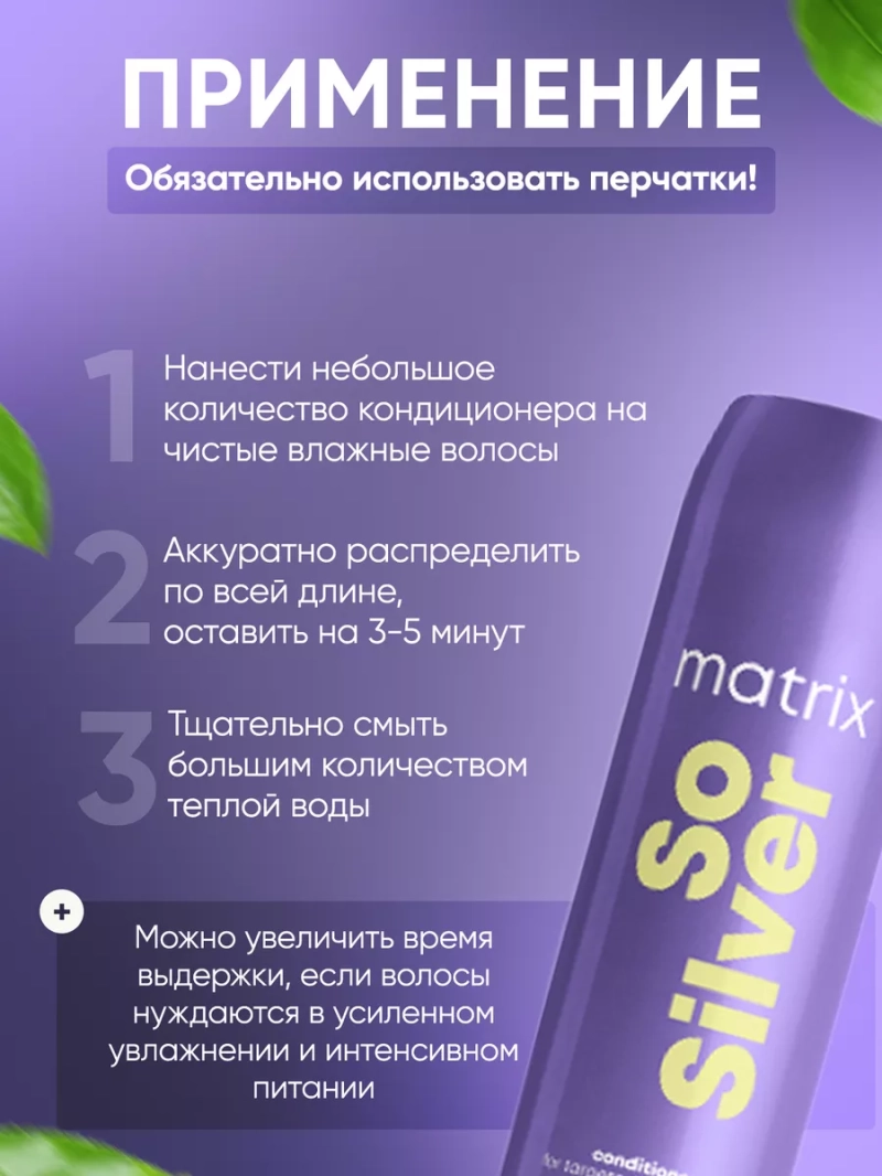 Холодный платиновый блонд требует особый уход для поддержания эффекта тонирования. Линия L’oreal Matrix Total Results Color Obsessed So Silver (Лореаль Матрикс Колор Обсэст Соу Сильвер) создана специально для светлых и седых волос и натуральных блондинок для того, чтобы нейтрализовать желтизну и сохранить холодный оттенок окрашивания.Инновационная формула работает эффективно, но действует бережно, поэтому может использоваться не только в профессиональных салонах мастерами – парикмахерами и барберами, но и в домашних условиях. Бальзам So Silver гарантирует результат уже после первого применения. Средство содержит особый набор компонентов, оптимальный для поврежденных, пористых волос. Инновационные составы с активным увлажняющим и восстанавливающим действием подчеркивают осветленные пряди и сохраняют качество полотна.Глицерин и масло подсолнуха смягчают жесткие волосы. Лимонная кислота закрывает кутикулу и продлевает насыщенность и чистоту цвета.Мощный комплекс витаминов заполняет и выравнивает поврежденные участки. Ухаживающие и кондиционирующие компоненты направленно действуют на сухие и хрупкие поврежденные участки, делают волосы менее жесткими после химического воздействия. Активные вещества укрепляют структуру волос, уменьшают травмирование в процессе расчесывания и укладки. Кондиционер добавляет глянцевый блеск на каждой прядке, устраняет сухость и ломкость. Средство эффективно восстанавливает пористую структуру на поверхности и изнутри. Кондиционер заботится о кончиках, предотвращает их дальнейшее их сечение. Помогает снизить пушистость и электризацию. Волосы становятся шелковистыми, живыми, струящимися без спутанности. За короткое время кондиционер придает волосам ухоженный и сияющий вид. Не утяжеляет и не оставляет чувство жирных волос.Регулярное использование кондиционера поможет минимизировать использование силиконовых спреев – несмывашек и масел для разглаживания.Сохрани холодный блонд легко с L’oreal Matrix Total Results Color Obsessed So Silver!