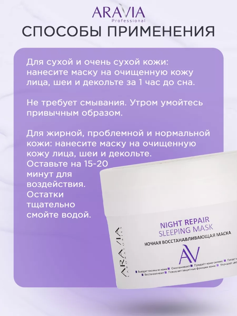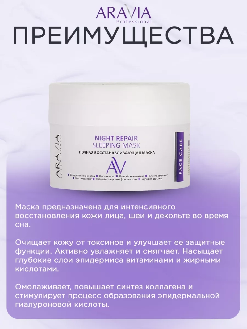 НОЧНАЯ ВОССТАНАВЛИВАЮЩАЯ МАСКА NIGHT REPAIR SLEEPING MASK, 150 МЛ. Маска предназначена для интенсивного восстановления кожи лица, шеи и декольте во время сна. Очищает кожу от токсинов и улучшает ее защитные функции. Активно увлажняет и смягчает. Насыщает глубокие слои эпидермиса витаминами и жирными кислотами. Омолаживает, повышает синтез коллагена и стимулирует процесс образования эпидермальной гиалуроновой кислоты. Разглаживает морщинки, укрепляет и оживляет утомленную и дряблую кожу, делает ее более упругой и эластичной. Улучшает цвет лица, делает кожу сияющей, свежей и отдохнувшей утром. Рекомендована для сухой и очень сухой кожи. Назначение: для лица, шеи и декольте. Возрастные изменения, тонус кожи. Вывод токсинов. Улучшение цвета лица. Снятие следов стресса, усталости и вредного воздействия окружающей среды. Рекомендации для использования: рекомендуется использовать 1-2 раза в неделю. ДЕЙСТВИЕ: омолаживающее, питательное, увлажняющее, освежающее, защитное, выводит токсины, придает сияние, улучшает цвет лица. Биоактивный состав: экстракт фиалки, витамин В3, витамин Е, биофлавоноиды, экстракт брокколи, экстракт алоэ, масло ши, масло жожоба. Экстракт фиалки обладает очищающим, антибактериальным, осветляющим и антиоксидантным действием. Фитоэстрогены фиалки восстанавливают способности кожи самостоятельно синтезировать гиалуроновую кислоту. Способствует снятию воспаления и кожного зуда. Увлажняет, витаминизирует кожу, придает ей сияние. Экстракт алоэ увлажняет, успокаивает, омолаживает. СПОСОБ ПРИМЕНЕНИЯ: Для сухой и очень сухой кожи: нанесите маску на очищенную кожу лица, шеи и декольте за 1 час до сна. Не требует смывания. Утром умойтесь привычным образом. Для жирной, проблемной и нормальной кожи: нанесите маску на очищенную кожу лица, шеи и декольте. Оставьте на 15-20 минут для воздействия. Остатки тщательно смойте водой. Меры предосторожности: не наносите на поврежденную кожу и избегайте попадания в глаза. При попадании в глаза тщательно промойте водой.