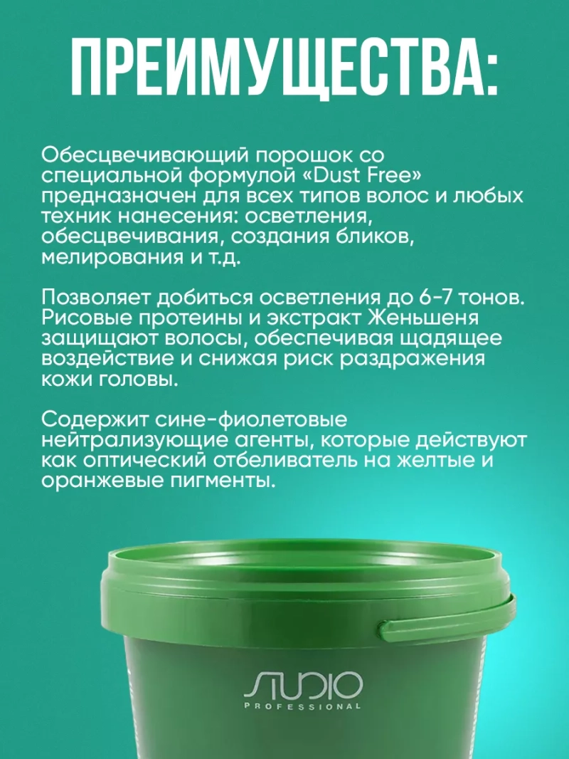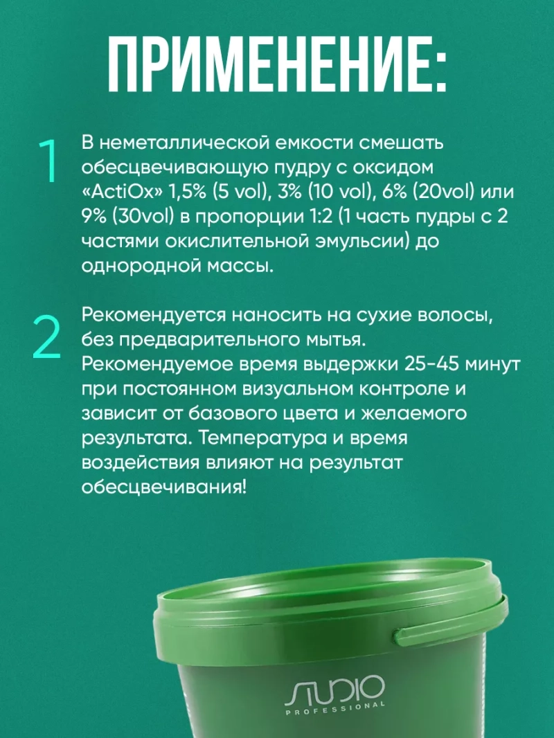 Обесцвечивающий порошок для волос с экстрактом женьшеня и рисовыми протеинами "Dust Free" предназначен для всех типов волос и любых техник нанесения: осветления, обесцвечивания, создания бликов, мелирования и т.д. Позволяет добиться осветления до 6-7 тонов. Рисовые протеины и экстракт Женьшеня защищают волосы, обеспечивая щадящее воздействие и снижая риск раздражения кожи головы. Содержит сине-фиолетовые нейтрализующие агенты, которые действуют как оптический отбеливатель на желтые и оранжевые пигменты. ТОЛЬКО ДЛЯ ПРОФЕССИОНАЛЬНОГО ПРИМЕНЕНИЯ. Способ применения: в неметаллической емкости смешать обесцвечивающую пудру с оксидом "ActiOx" 1,5% (5 vol), 3% (10 vol), 6% (20vol) или 9% (30vol) в пропорции 1:2 (1 часть пудры с 2 частями окислительной эмульсии) до однородной массы. Важно: После смешивания пудры и оксида дать постоять смеси около 1 минуты и повторно размешать получившуюся смесь. Рекомендуется наносить на сухие волосы, без предварительного мытья. Рекомендуемое время выдержки 25-45 минут при постоянном визуальном контроле и зависит от базового цвета и желаемого результата. Температура и время воздействия влияют на результат обесцвечивания! Не рекомендуется контакт с кожей головы смеси, с использованием 12% оксида. По окончания процесса обесцвечивания тщательно промыть волосы большим количеством воды, затем рекомендуется применение шампуня для всех типов волос глубокой очистки. Состав: AMMONIUM PERSULFATE, POTASSIUM PERSULFATE, SODIUM METASILICATE, KAOLIN, SODIUM STEARATE, SODIUM SILICATE, MAGNESIUM CARBONATE, TALC, MINERAL OIL/PARAFFINUM LIQUIDUM, CELLULOSE GUM, MALTODEXTRIN, TETRASODIUM EDTA, SODIUM LAURYL SULFATE, C.I. 77007 / ULTRAMARINES, PANAX GINSENG ROOT, HYDROLIZED RICE PROTEIN