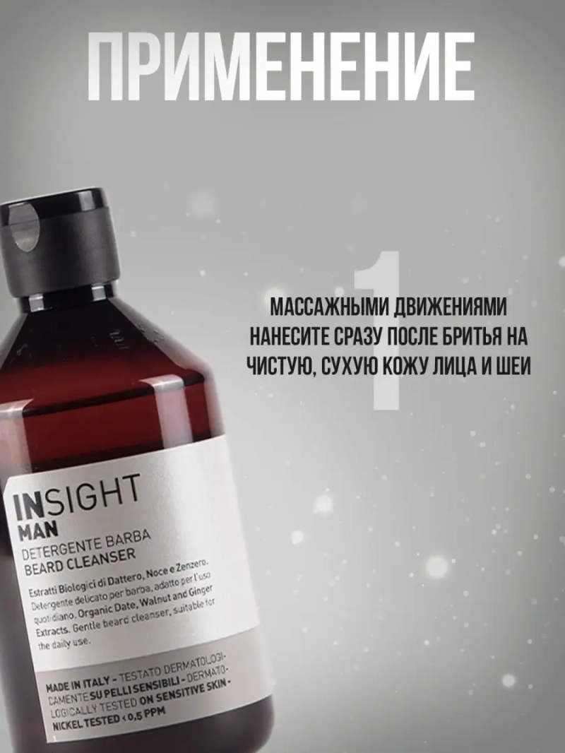 Регулярный базовый уход за кожей лица у мужчин и парней обязательно должен включать очищающие средства. Профессиональный итальянский бренд INSIGHT предлагает специальную уходовую серию MAN, которая поможет сделать уход даже за самой чувствительной и требовательной мужской кожей максимально комфортным. Ежедневный уход за растительностью на лице следует начинать с очищающего средства для усов и бороды, которое обеспечивает чистоту, мягкость и гладкость волоскам. Гель делает щетину послушной и ухоженной. Шампунь придает шелковистость и переливающийся блеск. Очищающее средство содержит особый набор органических экстрактов, который насыщает кожу витаминами и полезными элементами. Органический экстракт финика является мощным антиоксидантом и оказывает противовоспалительное действие. Органическое масло подсолнечника обладает защитными и регенерирующими функциями. Экстракт имбиря укрепляет и оказывает омолаживающее действие. Бессульфатный продукт содержит флавоноиды, которые восстанавливают кожу и налаживают процесс естественного обновления эпидермиса. Жидкое средство оказывает антибактериальный действие, но сохраняет Ph – баланс кожи. Шампунь делает бороду послушной и минимизирует использование дополнительных несмываемых средств. Натуральный гель положительно влияет на раздраженную кожу, придает мягкость и эластичность. Увлажняющий шампунь активизирует рост щетины, делая ее густой и крепкой. Кондиционирующий продукт распутывает волоски и придает форму бороде. Средство не вызывает сухость и раздражение, убирает шелушения и стянутость. Приятная консистенция насыщает кожу полезными компонентами и гарантирует улучшение состояния кожного покрова. Витаминный гель не провоцирует появление воспалений, комедонов. Не забивает поры. Предупреждает появление вросших волосков и прыщей. Без сульфатов и парабенов. Без спирта и искуственных красителей. Универсальное средство подходит для жирной и сухой проблемной кожи лица. ИНСАЙТ МЭН позволит Вам всегда выглядеть аккуратно и опрятно!
