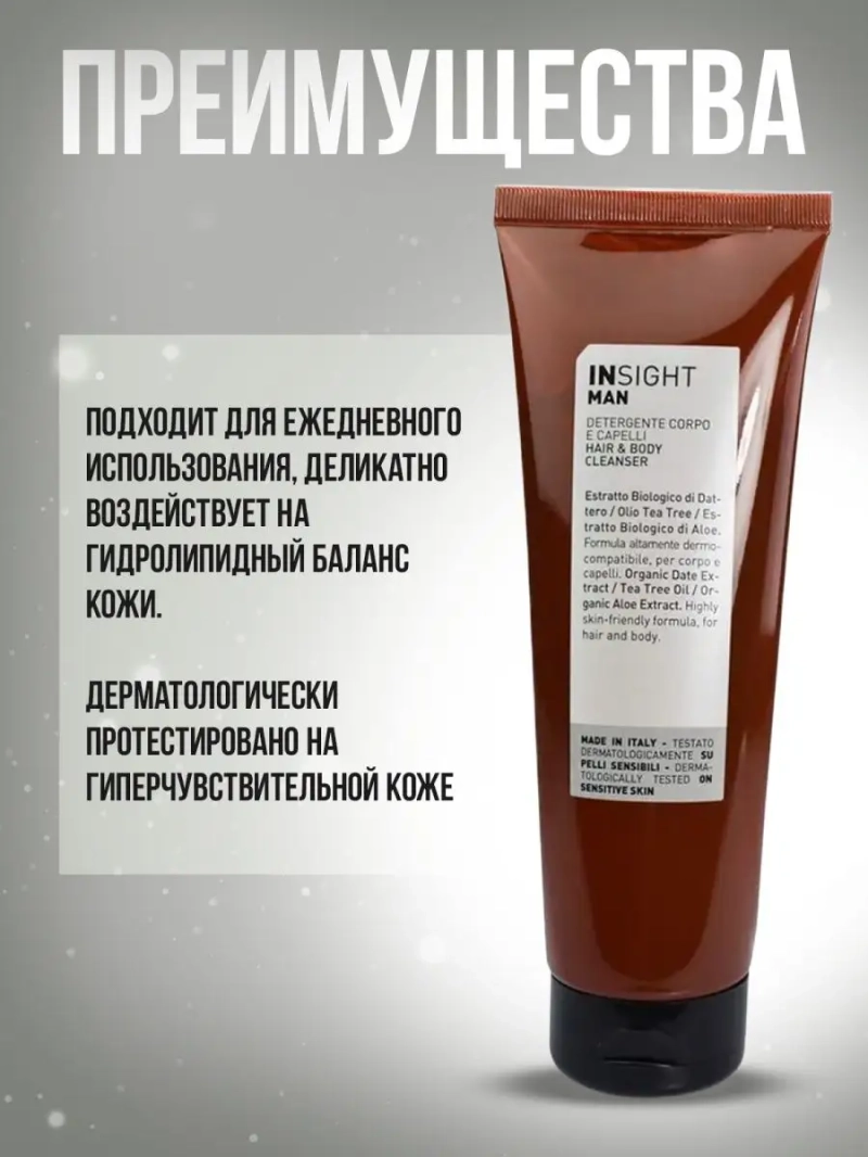 Регулярный базовый уход за кожей головы, волосами и телом лица у мужчин и парней обязательно должен включать очищающие средства. Профессиональный итальянский бренд INSIGHT предлагает специальную уходовую серию MAN, которая поможет сделать уход даже за самой чувствительной и требовательной мужской кожей максимально комфортным. Мягкое очищающее средство для волос и тела 2 в 1 подходит для ежедневного использования и идеально даже для сухой и чувствительной кожи. Косметический продукт заменяет шампунь и гель для душа, но прекрасно выполняет функции обоих средств. Особый набор органических экстрактов в составе средства восстанавливает гидролипидный баланс кожи и сохраняет естественную защиту дермы без изменений. Органический экстракт финика является мощным антиоксидантом и защищает от вредного воздействия внешних факторов. Масло чайного дерева освежает, снимает зуд и раздражение. Вытяжка их чайного дерева регулирует работу сальных желез и избавляет кожу и волосы от избыточной жирности, которая часто бывает у мужчин. Органический экстракт алоэ оказывает увлажняющее и успокаивающее действие. Средство придает волосам блеск и эластичность. Шампунь эффективно очищает, надолго придает ощущение свежести и препятствует появлению перхоти. Средство убирает шелушения и чувство стянутости. Многофункциональное средство питает поврежденные пряди и улучшает общее состояние волос. Шампунь делает шевелюру мягкой и послушной и минимизирует использование дополнительных несмываемых средств. Как гель для душа, чрезвычайно мягкое универсальное средство помимо функции очищения обеспечивает телу деликатный уход. Глицерин растительного происхождения уменьшает возможные раздражения и стимулирует процессы клеточного восстановления и регенерации. Жидкое очищающее средство оказывает антибактериальный действие, но сохраняет Ph – баланс кожи. Средство оказывает бодрящий эффект, насыщает клетки энергией и надолго дарит свежий аромат. Салонное средство превращает процесс принятия душа в спа-процедуру.
