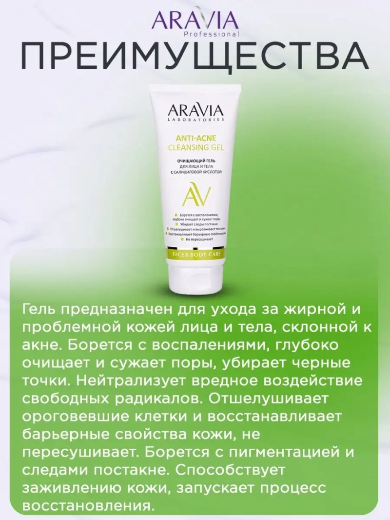 ОЧИЩАЮЩИЙ ГЕЛЬ ДЛЯ ЛИЦА И ТЕЛА С САЛИЦИЛОВОЙ КИСЛОТОЙ ANTI-ACNE CLEANSING GEL, 200 МЛ. Гель предназначен для ухода за жирной и проблемной кожей лица и тела, склонной к акне. Борется с воспалениями, глубоко очищает и сужает поры, убирает черные точки. Нейтрализует вредное воздействие свободных радикалов. Отшелушивает ороговевшие клетки и восстанавливает барьерные свойства кожи, не пересушивает. Борется с пигментацией и следами постакне. Способствует заживлению кожи, запускает процесс восстановления. Стимулирует выработку коллагена и эластина. Назначение: глубокое очищение, борьба с воспалениями, сужение пор, отшелушивание. Рекомендации для использования: для ежедневного применения. ДЕЙСТВИЕ: очищающее, отшелушивающее, регенерирующее, сужает поры, снимает воспаления. Биоактивный состав: салициловая кислота, пантенол, аллантоин, глицерин, ксантановая камедь. Салициловая кислота отшелушивает ороговевшие клетки, уменьшает поры, предупреждает появление высыпаний, способствует обновлению клеток. Пантенол обладает увлажняющим, заживляющим, смягчающим и разглаживающим действием. Делает кожу более эластичной, оказывает успокаивающее действие. Аллантоин обладает кератолическим, успокаивающим, заживляющим и противовоспалительным действием. Нейтрализует вредное воздействие свободных радикалов. Борется с бактериями. Глицерин глубоко увлажняет. Способствует лучшему проникновению влаги в глубокие слои кожи. Ксантановая камедь образует на коже защитную пленку, обладает увлажняющими и влагоудерживающими свойствами. СПОСОБ ПРИМЕНЕНИЯ: Небольшое количество геля нанесите на влажную кожу лица и тела. Очистите кожу легкими массажными движениями. Смойте водой. Меры предосторожности: не наносите на поврежденную кожу и избегайте попадания в глаза. При попадании в глаза тщательно промойте водой. Перед применением тестируйте на небольшом участке кожи.