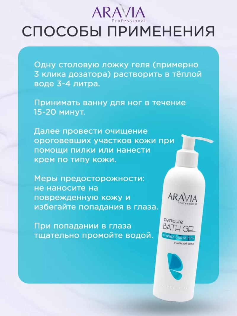ГЕЛЬ ОЧИЩАЮЩИЙ С МОРСКОЙ СОЛЬЮ PEDICURE BATH GEL, 300 МЛ. Гель для ножных ванн с натуральной морской солью и минералами эффективно очищает, освежает и подготавливает кожу ног к педикюру. Может использоваться как в комплексе, так и самостоятельно для расслабляющих и освежающих процедур. Активные компоненты геля (морские минералы, экстракты водорослей, эфирное масло розмарина и лаванды) обладают дезодорирующим, успокаивающим и расслабляющим действием. Эффективно размягчают ороговелые участки кожи стоп, позволяя без усилий избавиться от натоптышей и мозолей. Регулярное использование геля для ножных ванн способствует профилактике развития грибковых заболеваний, снимает стресс, делает кожу ног здоровой и ухоженной. Назначение: для процедуры SPA-педикюр, для ножных ванн, размягчения и подготовки стоп к обработке инструментом. Биоактивный состав: глицерин, экстракт ламинарии, экстракт фукуса, мочевина, эфирное масло лаванды, эфирное масло розмарина. Состав продукта (INCI): Aqua, Glycerin, Sodium Laureth Sulfate, Cocamidopropyl Betaine, Sodium Chloride, Fucus Vesiculosus Extract, Laminaria Saccharina Extract, Urea, Lavandula Angustifolia (Lavender) Oil, Rosmarinus Officinalis Leaf Oil, Disodium EDTA, Benzyl Alcohol, MI, MCI, Parfum, CI 42090. СПОСОБ ПРИМЕННИЯ: Одну столовую ложку геля (примерно 3 клика дозатора) растворить в тёплой воде 3-4 литра. Принимать ванну для ног в течение 15-20 минут. Далее провести очищение ороговевших участков кожи при помощи пилки или нанести крем по типу кожи. Меры предосторожности: не наносите на поврежденную кожу и избегайте попадания в глаза. При попадании в глаза тщательно промойте водой.