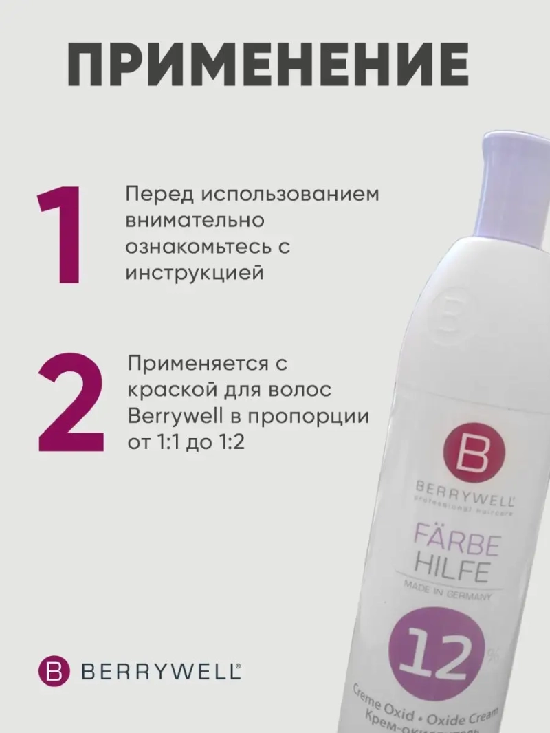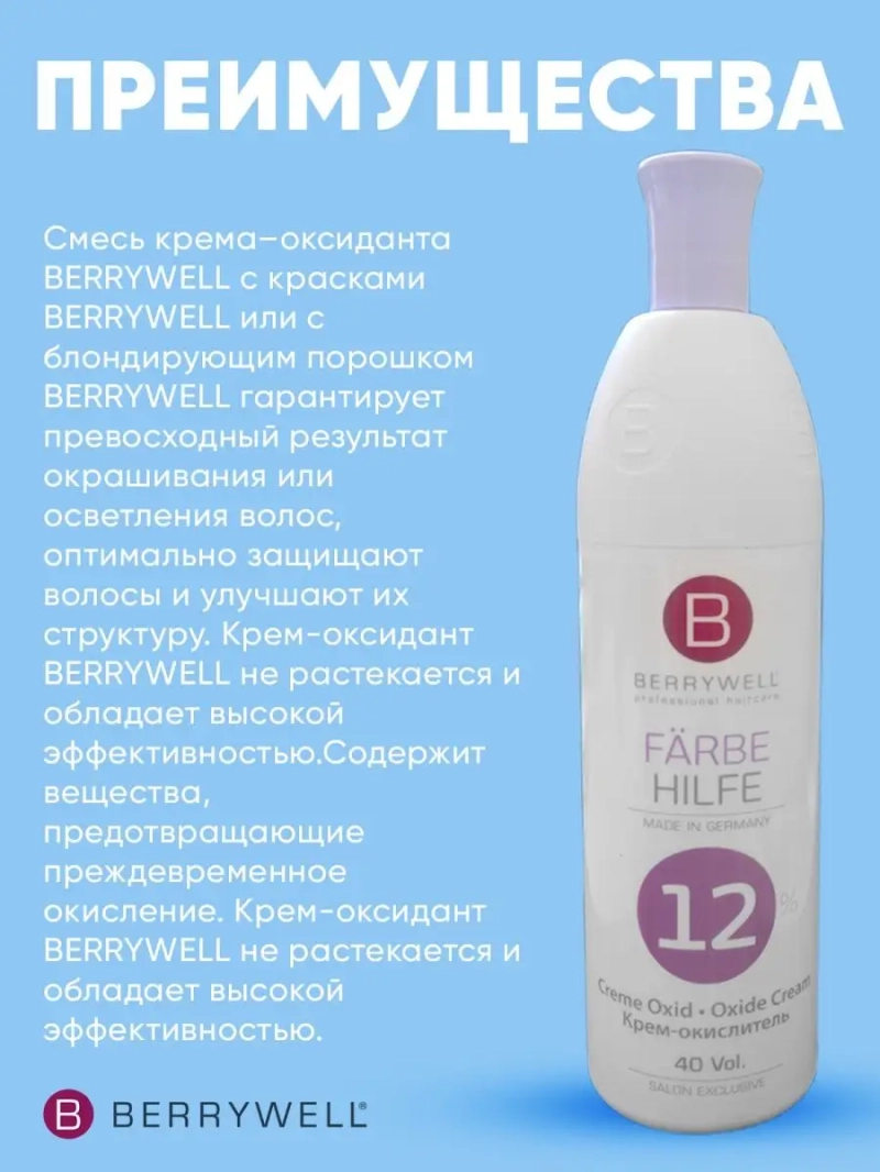 Окислитель Special Processing Lotion, 12%, 1001 мл. Окислитель Berrywell Farbehilfe создан специально для смешивания с краской Berrywell Farbfreude. Кремовая структура, не капающая, эластичная. Специальный комплекс предотвращает преждевременное осветление. Смесь крема–оксиданта BERRYWELL с красками BERRYWELL или с блондирующим порошком BERRYWELL гарантирует превосходный результат окрашивания или осветления волос, оптимально защищают волосы и улучшают их структуру. Крем-оксидант BERRYWELL не растекается и обладает высокой эффективностью.Содержит вещества, предотвращающие преждевременное окисление. Крем-оксидант BERRYWELL не растекается и обладает высокой эффективностью. Производится на основе эмульсии.