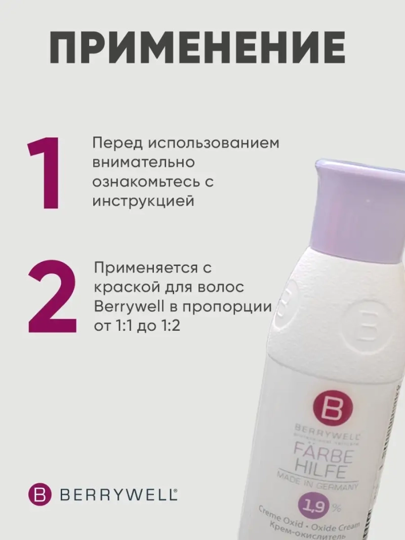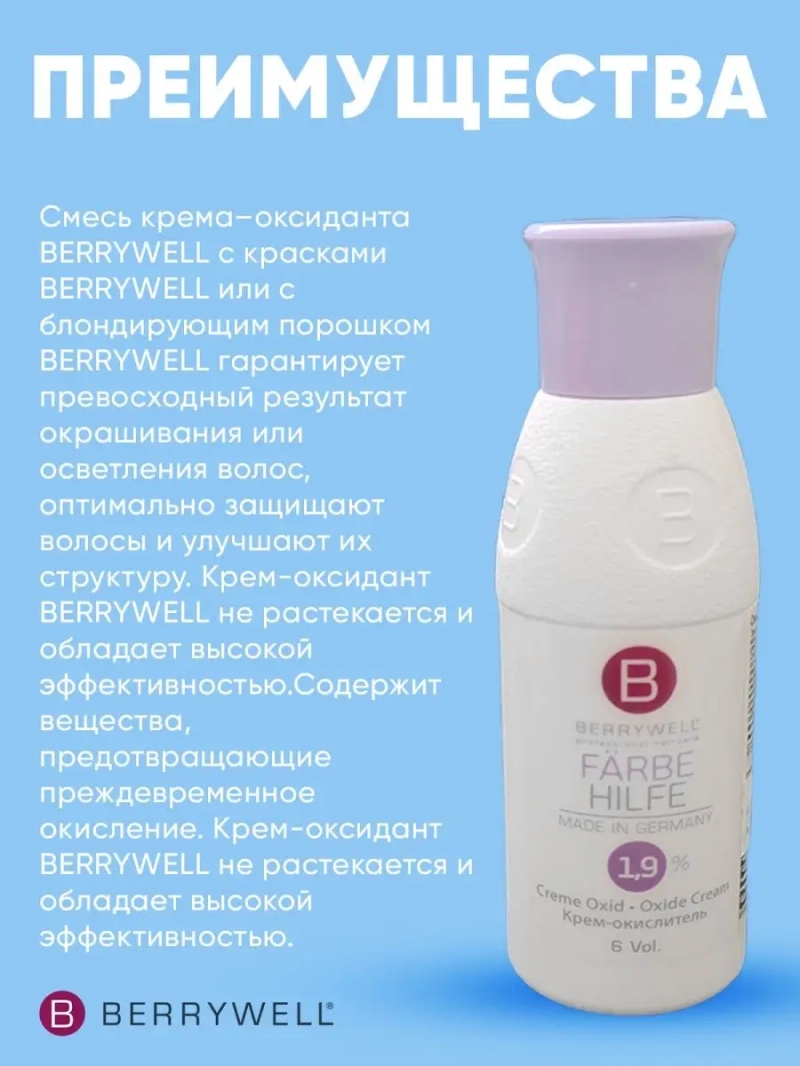 Окислитель Special Processing Lotion, 1,9%, 61 мл. Окислитель Berrywell Farbehilfe создан специально для смешивания с краской Berrywell Farbfreude. Кремовая структура, не капающая, эластичная. Специальный комплекс предотвращает преждевременное осветление. Смесь крема–оксиданта BERRYWELL с красками BERRYWELL или с блондирующим порошком BERRYWELL гарантирует превосходный результат окрашивания или осветления волос, оптимально защищают волосы и улучшают их структуру. Крем-оксидант BERRYWELL не растекается и обладает высокой эффективностью.Содержит вещества, предотвращающие преждевременное окисление. Крем-оксидант BERRYWELL не растекается и обладает высокой эффективностью. Производится на основе эмульсии.
