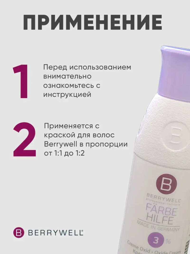 Окислитель Special Processing Lotion, 3%, 61 мл. Окислитель Berrywell Farbehilfe создан специально для смешивания с краской Berrywell Farbfreude. Кремовая структура, не капающая, эластичная. Специальный комплекс предотвращает преждевременное осветление. Смесь крема–оксиданта BERRYWELL с красками BERRYWELL или с блондирующим порошком BERRYWELL гарантирует превосходный результат окрашивания или осветления волос, оптимально защищают волосы и улучшают их структуру. Крем-оксидант BERRYWELL не растекается и обладает высокой эффективностью.Содержит вещества, предотвращающие преждевременное окисление. Крем-оксидант BERRYWELL не растекается и обладает высокой эффективностью. Производится на основе эмульсии.